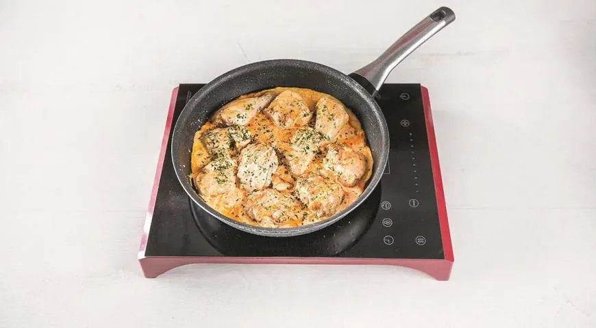 Верните курицу в сковороду, аккуратно перемешайте с соусом, добавьте сушеный тимьян и тушите на медленном огне под крышкой 20 мин.