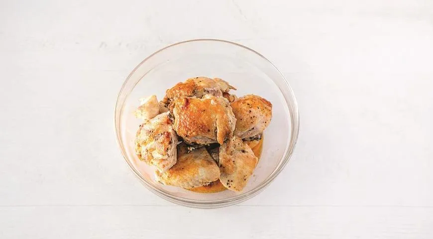 Уменьшите огонь до чуть ниже среднего, накройте сковороду крышкой и готовьте курицу еще 10 мин. (если у вас крупная домашняя птица, готовьте ее подольше, 20–25 мин.). Переложите курицу в миску вместе с образовавшимся соком и сохраняйте в тепле.