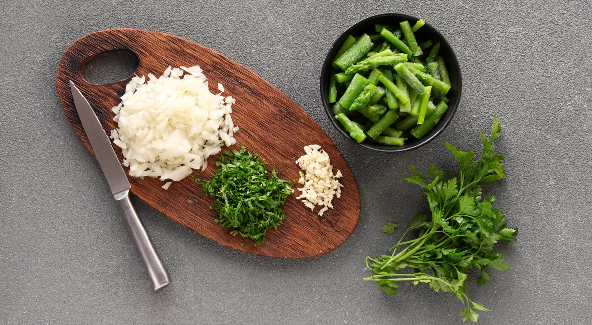 Наломайте замороженную спаржу небольшими кусочками. Нарежьте лук маленькими кубиками. Измельчите чеснок. Отделите от стеблей листья петрушки и мелко порубите.