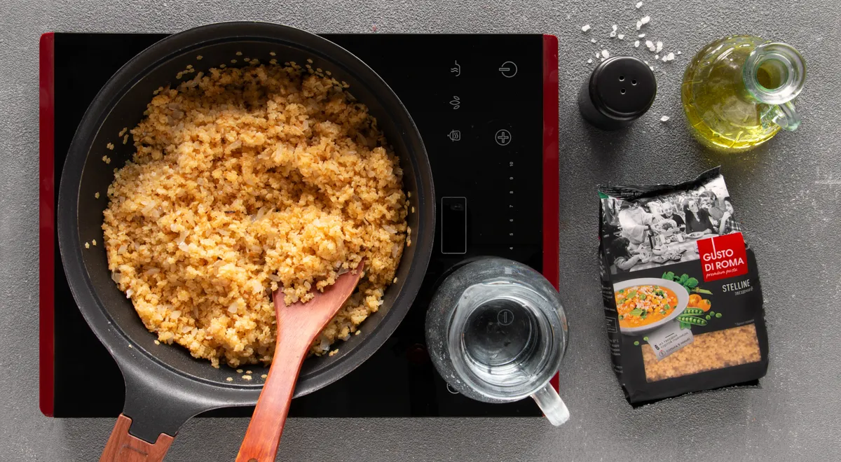 Добавьте в сковороду оставшееся оливковое масло и потушите лук до прозрачности, 5 мин. Всыпьте «звёздочки», влейте 400 мл горячей воды, посолите и доведите на сильном огне до кипения. Уменьшите нагрев до среднего, накройте крышкой и готовьте 3 мин.