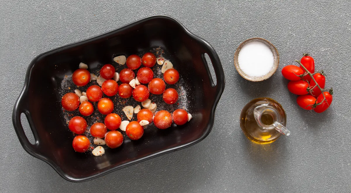 Разогрейте духовку до 180 °С, смажьте оливковым маслом жаростойкую форму 25х35 см. Сложите в форму целые помидоры черри, добавьте крупно нарезанный чеснок, посолите и посыпьте хлопьями чили. Полейте оливковым маслом, перемешайте и запекайте на среднем уровне духовки в течение 40 мин.