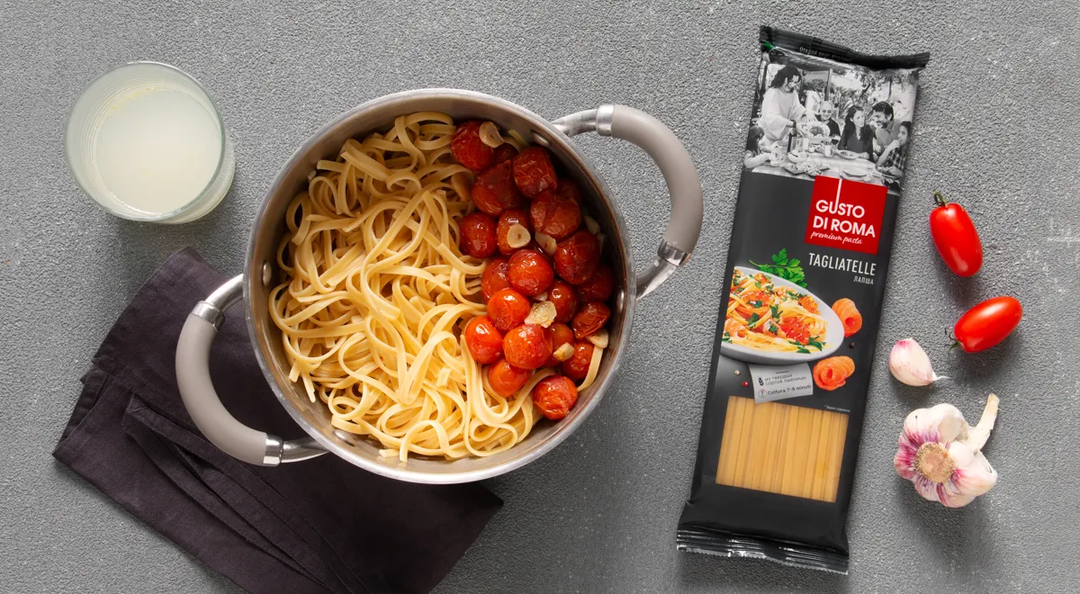 В большом количестве подсоленной воды отварите тальятелле до упругости, 3 мин. Отбросьте на дуршлаг, 120 мл жидкости от варки сохраните. Верните пасту в кастрюлю, добавьте запечённые помидоры вместе с образовавшимся соусом из формы. Влейте жидкость от варки и аккуратно перемешайте или встряхните кастрюлю.