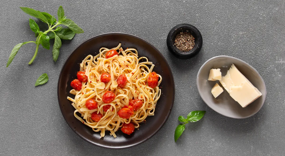 Очень легкая в приготовлении паста, особый вкусовой акцент которой придают запеченные черри и чеснок. И акцент этот настолько выразителен, что можно даже не посыпать готовое блюдо тертым сыром, особенно, если вы готовите для вегетарианцев. А если вы возьмете красные и желтые черри, то паста станет еще более привлекательной по колористике. Вместо тальятелле можно отварить спагетти или фетучини, а если вы не любите базилик посыпьте пасту листочками петрушки.