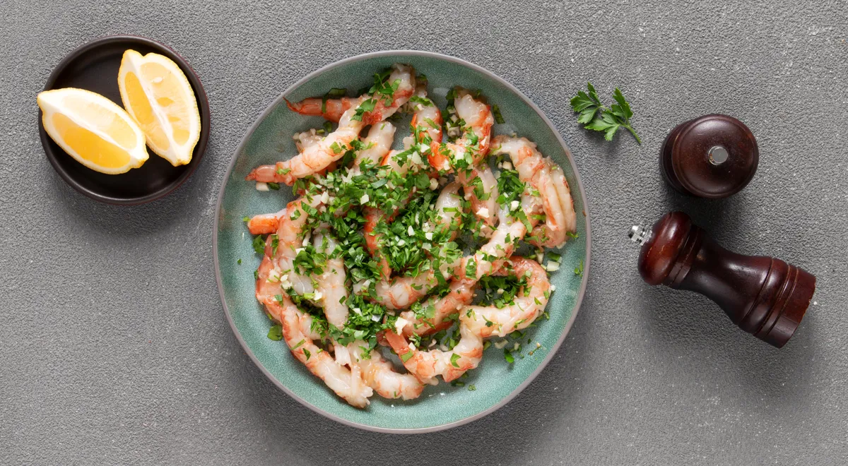 Нарежьте лук кубиками. Мелкой тёркой снимите 1 ч. л. лимонной цедры. Половину лимона нарежьте дольками. Измельчите чеснок, порубите листья петрушки. Сложите в миску цедру и половину чеснока, добавьте размороженные креветки, сбрызните 1 ст. л. лимонного сока, посолите, посыпьте перцем и оставьте на 5 мин.