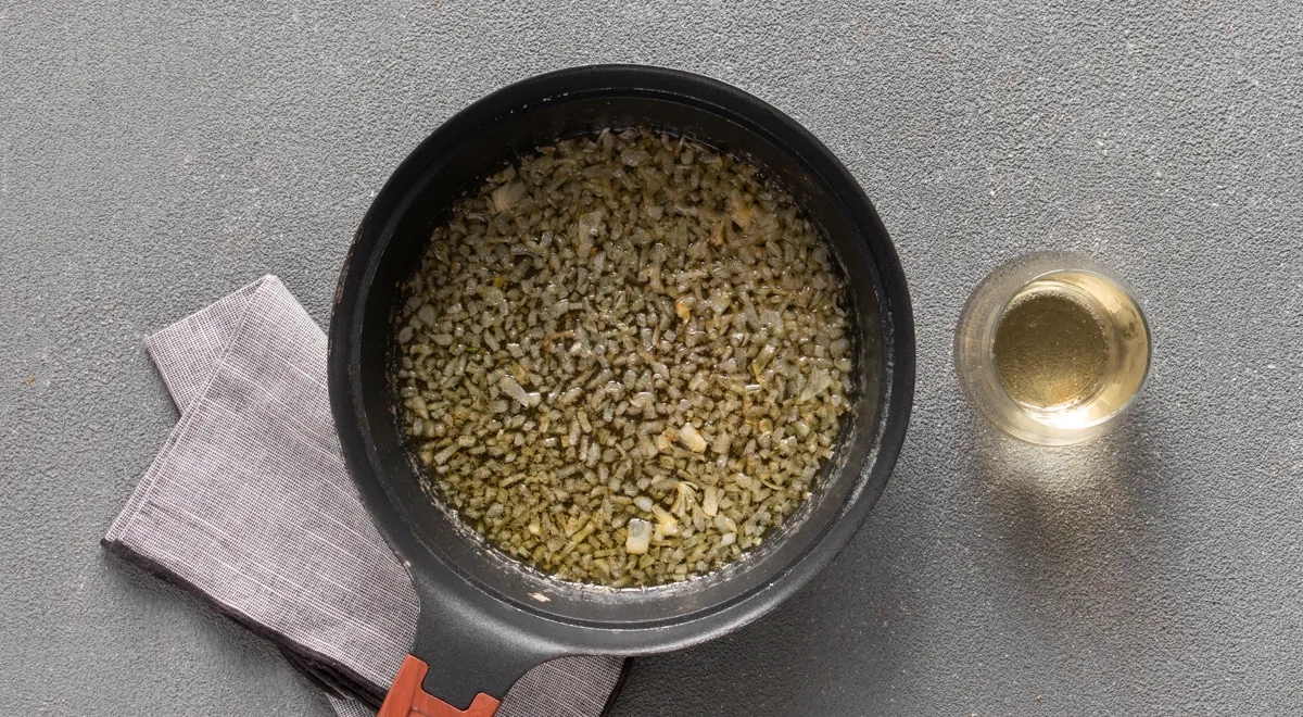 Добавьте в сковородку оставшееся оливковое масло, положите половину сливочного масла и лук. Обжарьте до лёгкого золотистого цвета, 3 мин. Влейте вино и доведите до кипения. Уменьшите нагрев до среднего и готовьте, помешивая, пока большая часть жидкости не испарится, 3 мин. Соус должен стать густым и блестящим.