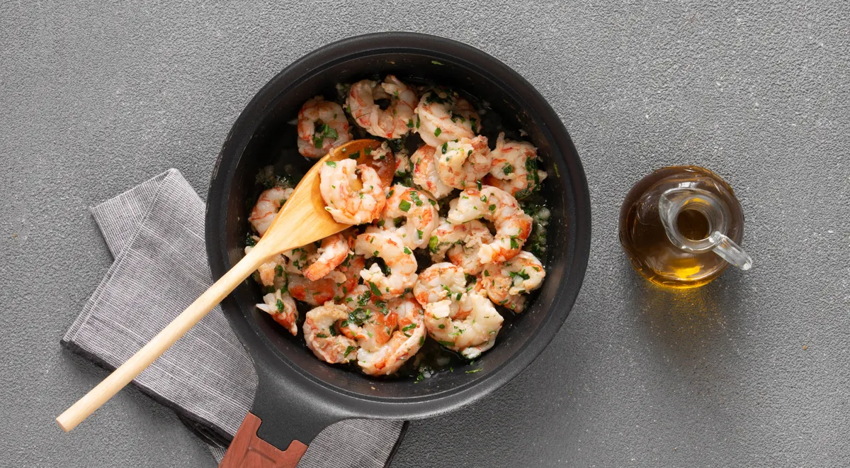 В ту же сковороду добавьте 2 ст. л. оливкового масла и выложите креветки. Жарьте на средне-сильном огне 3 мин, переверните и продолжайте готовить ещё 2 мин. Переложите на доску, немного остудите и разрежьте каждую креветку на две части.