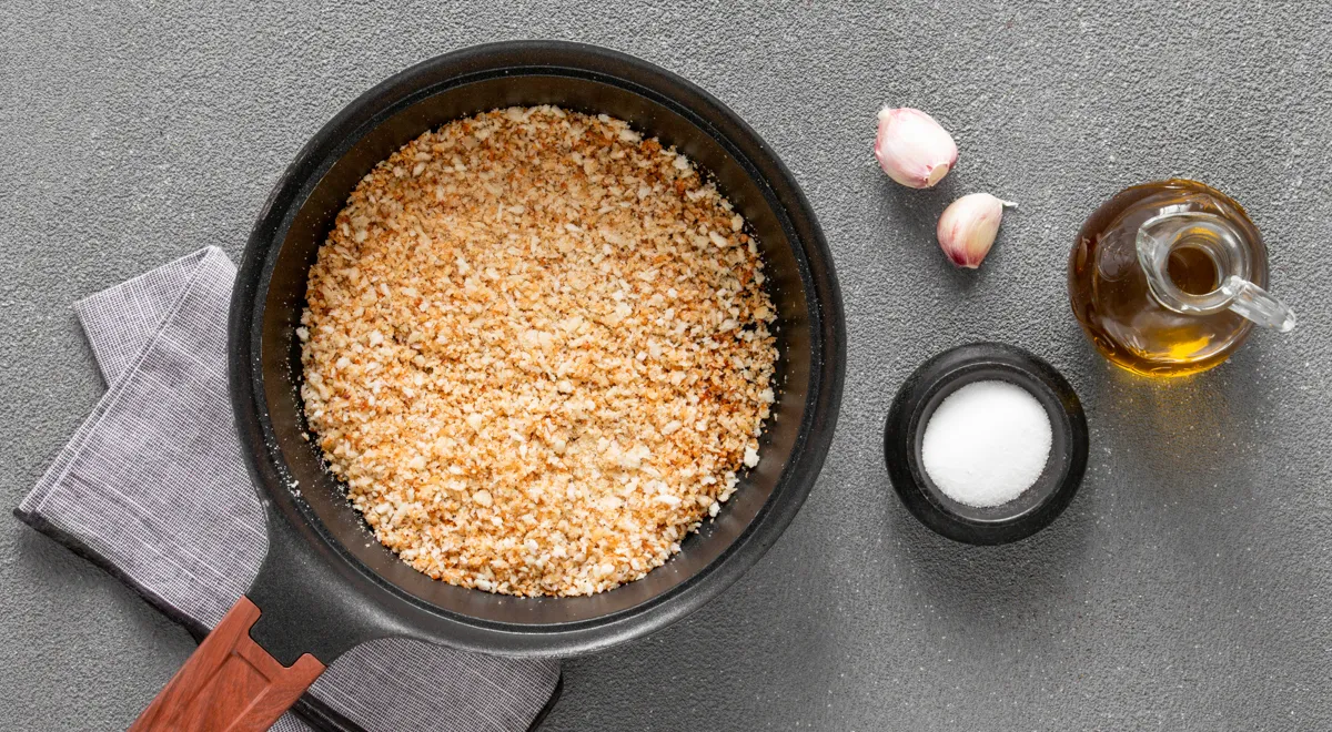 В сковороде с антипригарным покрытием разогрейте 2 ст. л. оливкового масла и всыпьте панировочные сухари. Посолите, перемешайте и обжаривайте на среднем огне до золотистого цвета, 3 мин. Добавьте оставшийся чеснок и продолжайте готовить ещё 1 мин, активно перемешивая сухари. Переложите в миску.