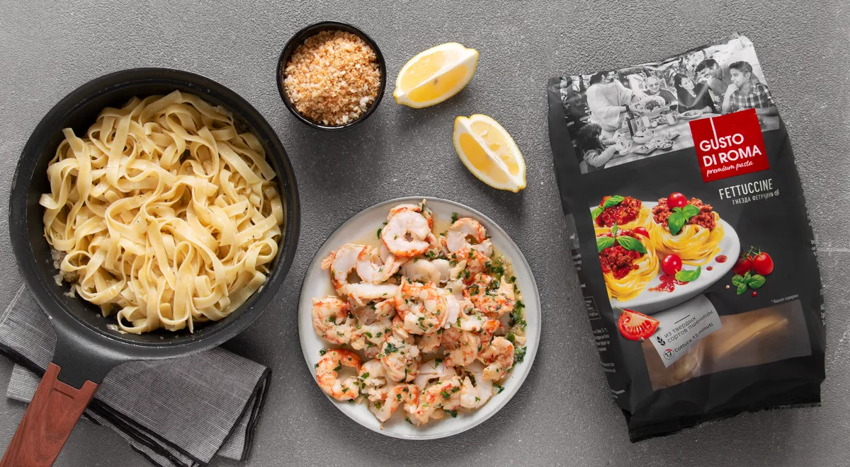 Отварите фетучини до состояния «аль денте» согласно инструкции на упаковке, отбросьте на дуршлаг, 150 мл жидкости сохраните. Переложите фетучини в сковородку с луковым соусом, влейте жидкость от варки, добавьте оставшееся сливочное масло и готовьте, аккуратно перемешивая, 2 мин. Снимите с огня, добавьте креветки и петрушку. Выжмите в сковороду сок из второй половины лимона, посыпьте перцем и перемешайте. Разложите пасту в тарелки, посыпьте обжаренными сухарями и подавайте с долькой лимона.