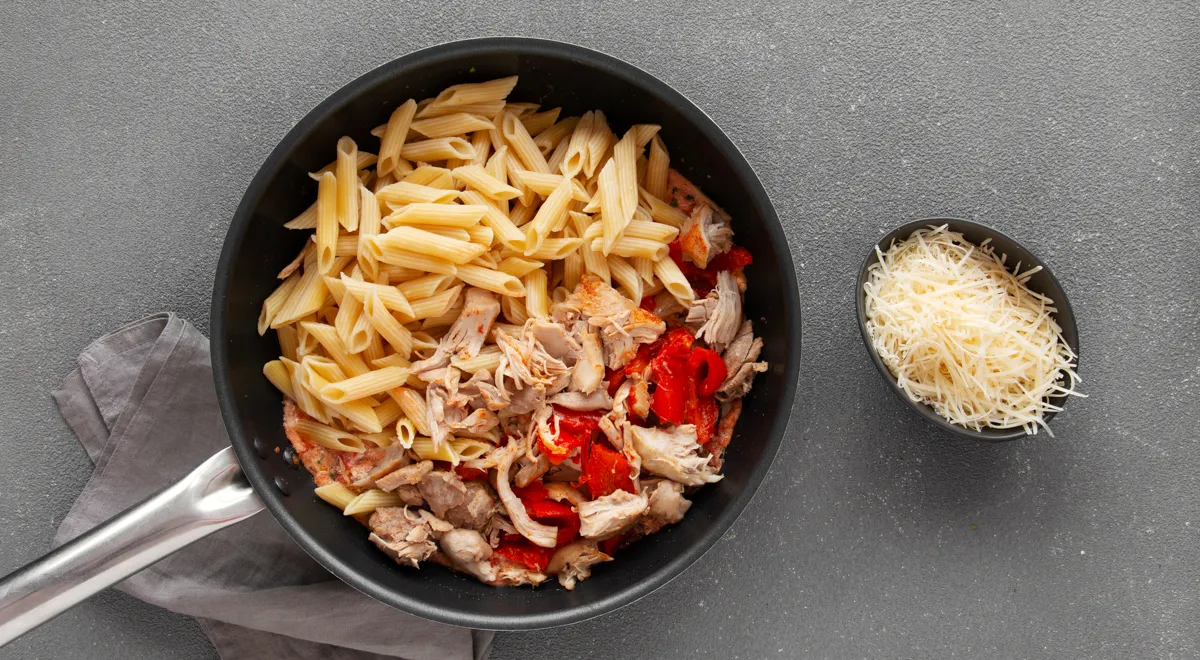 Переложите курицу на доску, разберите двумя вилками на волокна и выложите в соус. Добавьте «перья», запечённый перец и половину тёртого сыра. Прогрейте 2 мин и разложите в тарелки. Посыпьте оставшимся сыром и отложенными листочками базилика.