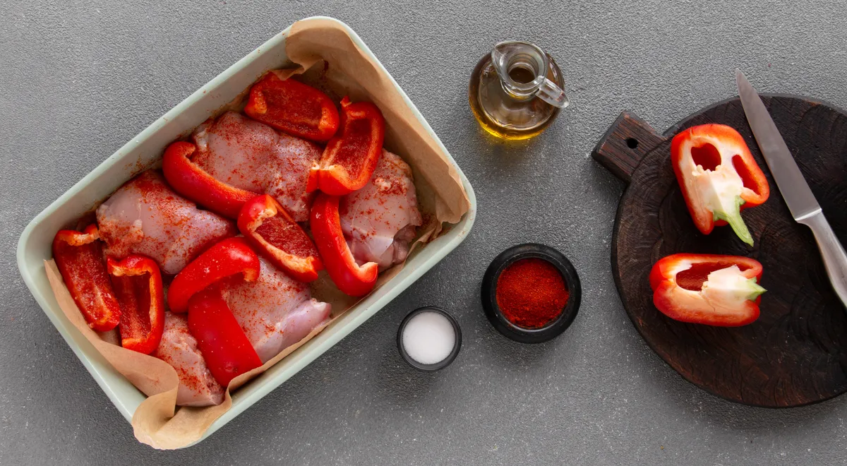 Запекая в духовке птицу и овощи, вы сразу получаете несколько бонусов – во-первых, запекание снижает калорийность продуктов, что немаловажно для всех, кто следит за весом, а во-вторых ваше участие в процессе сводится к минимуму – за вас все сделает духовка. Если вы будете запекать куриные бедрышки на кости, увеличьте время в духовке до 45 минут. А если решите придать блюду более яркий вид, используйте разноцветные сладкие перцы – вместо одного красного возьмите по половинке зеленого и желтого стручка.