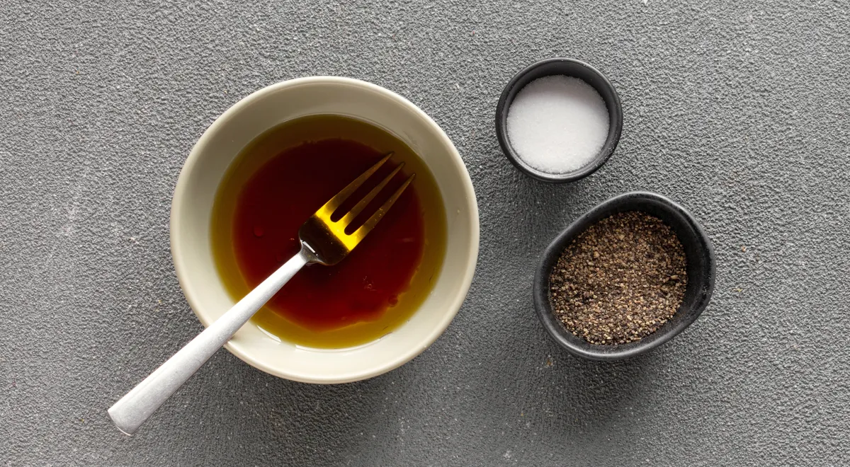 В небольшую миску влейте оливковое масло и винный уксус, посолите, приправьте перцем и взбейте вилкой.
