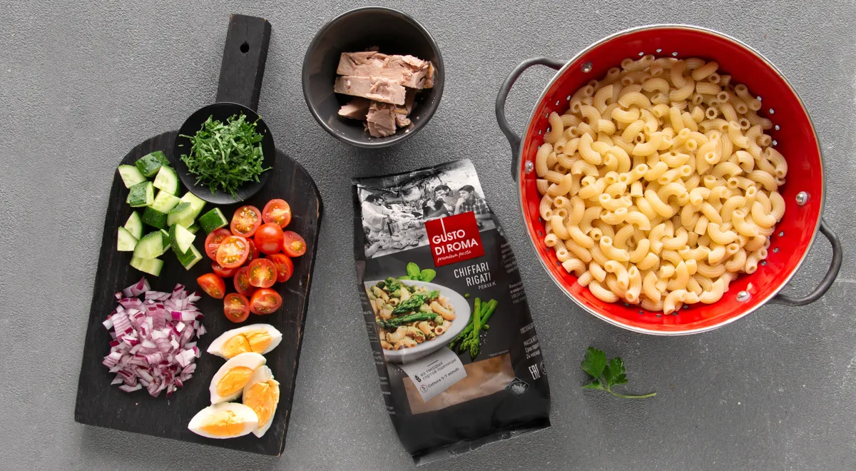 Вскипятите 1 л воды, посолите и отварите «рожки» до упругости согласно инструкции на упаковке, 8 мин. Отбросьте на дуршлаг и остудите. Сварите яйца вкрутую, 8 мин. залейте холодной водой, через 5 мин очистите скорлупу, яйца разрежьте вдоль на 4 части. Огурец и луковицу нарежьте мелкими кубиками. Помидоры черри разрежьте на половинки. Слейте жидкость из банки с тунцом. Измельчите петрушку.