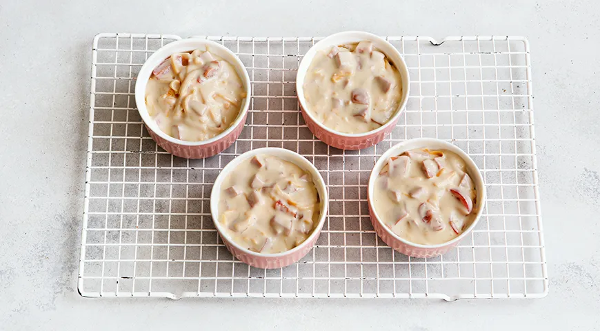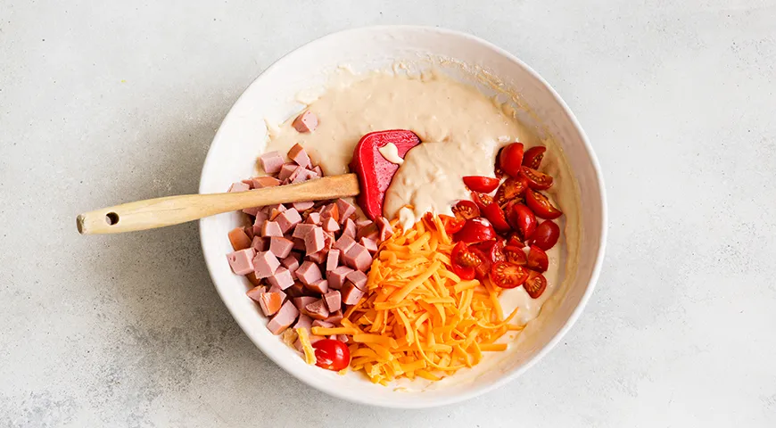 В тесто добавьте нарезанные сардельки, помидоры и сыр, перемешайте и разложите по формочкам на 3/4.
