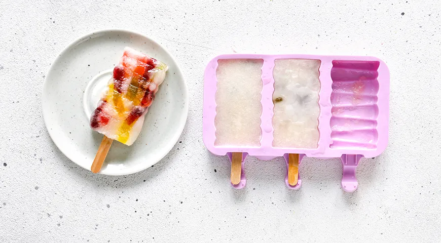 Готовое мороженое достаньте из морозилки. Опустите формочки на 30 сек в горячую воду, чтобы легко достать мороженое и сразу подавайте.