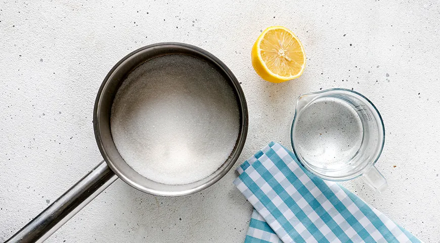 Из лимонов выжмите сок. В небольшой сотейник вылейте лимонный сок, воду и сахар. Доведите до кипения и охладите.