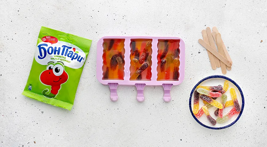 В формочки для мороженного (эскимо) выложите мармеладки, залейте лимонной смесью и уберите в морозилку на 6-8 ч.