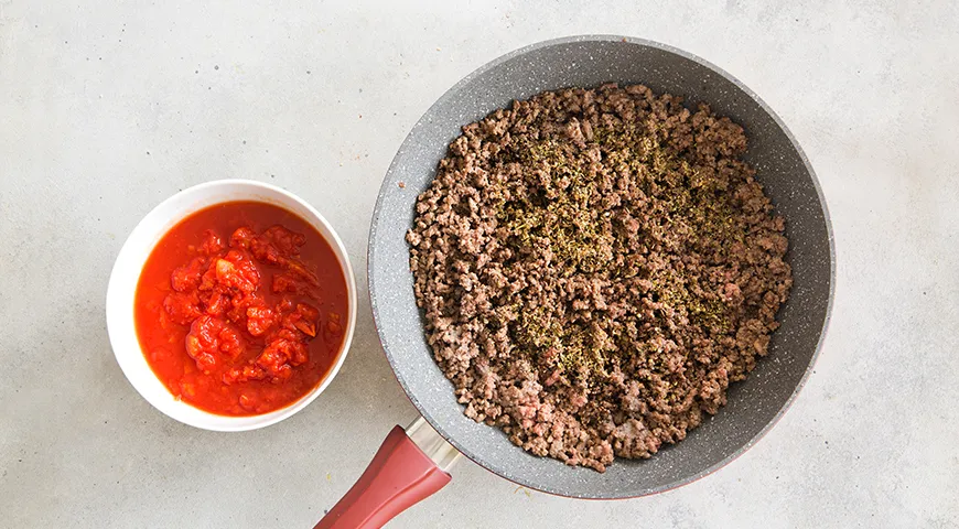 Разогрейте сковороду с растительным маслом на среднем огне. Выложите фарш и жарьте 7-8 мин, помешивая. Добавьте консервированные томаты и тушите еще 10 мин. Приправьте солью и перцем.