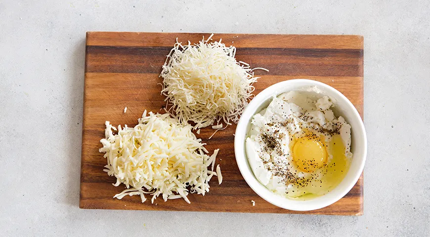 Моцареллу и пармезан натрите на терке. В средней миске смешайте рикотту и яйцо, хорошо перемешайте, приправьте солью и перцем по вкусу.