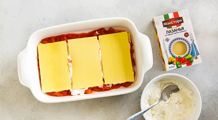 В подготовленную форму выложите немного соуса с фаршем, распределите по дну формы. Сверху выложите листы лазаньи, полейте ¼ томатного соуса, затем выложите половину смеси рикотты и распределите.