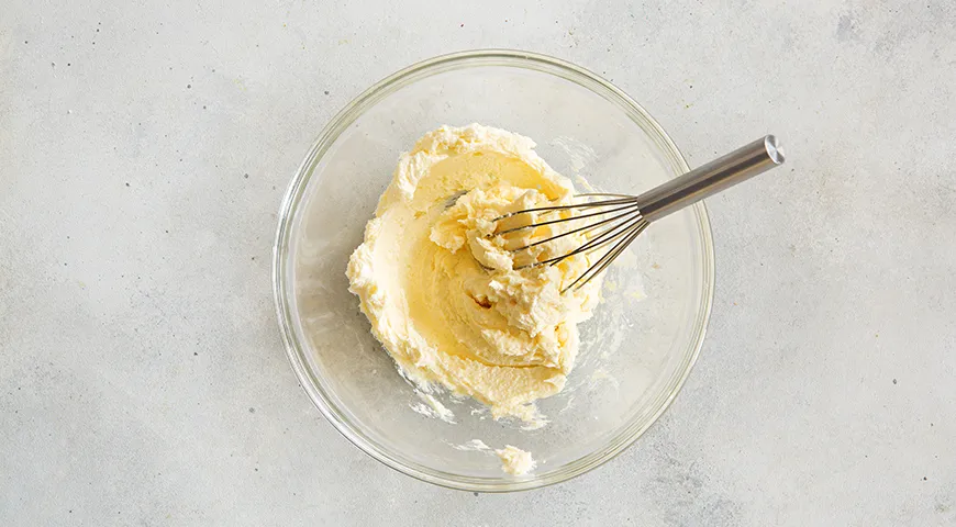 В большую миску выложите размягченное сливочное масло, сахар и ванильный сахар. Взбейте масло с сахаром до пышной массы.