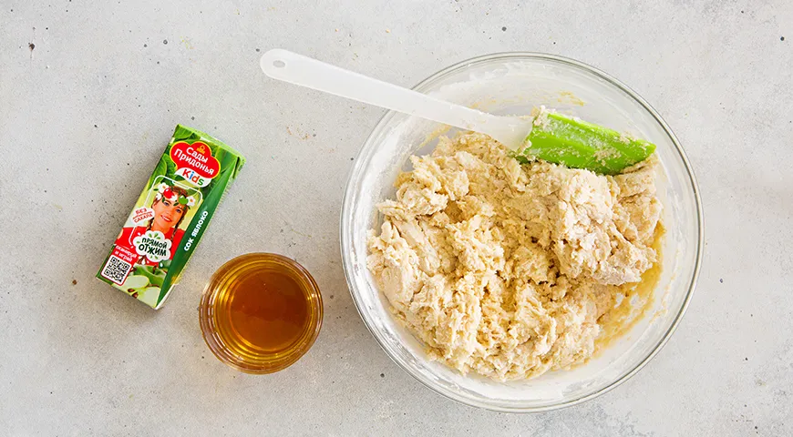 Введите сухую смесь к яично-масляной смеси и тщательно перемешайте до однородной густой консистенции. Добавьте к тесту яблочный сок и еще раз перемешайте.