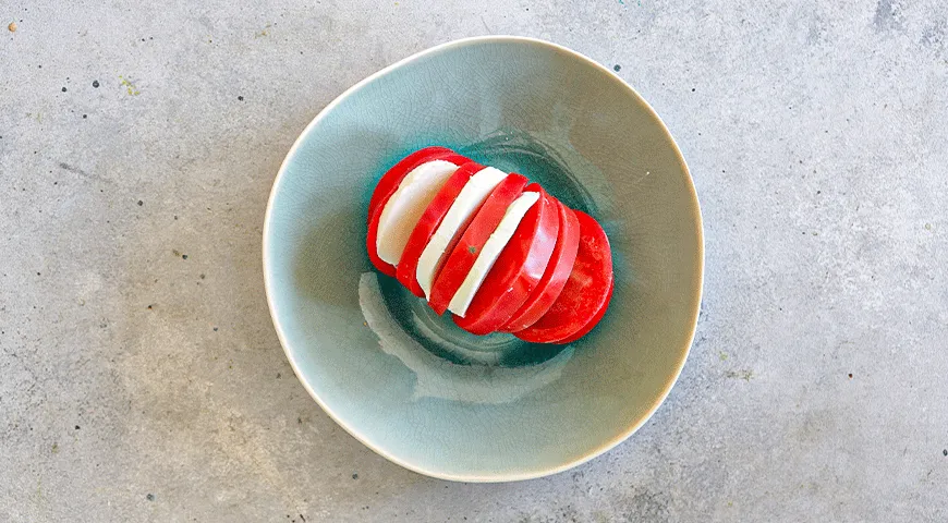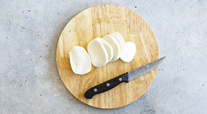 Выньте моцареллу из рассола, обсушите бумажными полотенцами и нарежьте кружками толщиной 3 мм.
