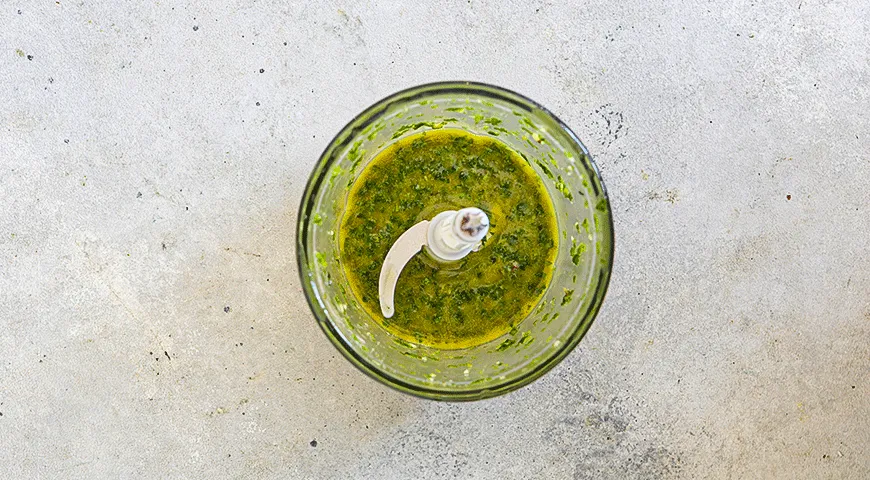 Отделите от стеблей листья базилика и тимьяна и сложите в стакан погружного блендера. Влейте оливковое масло и бальзамический уксус, добавьте чеснок и измельчите до однородности.