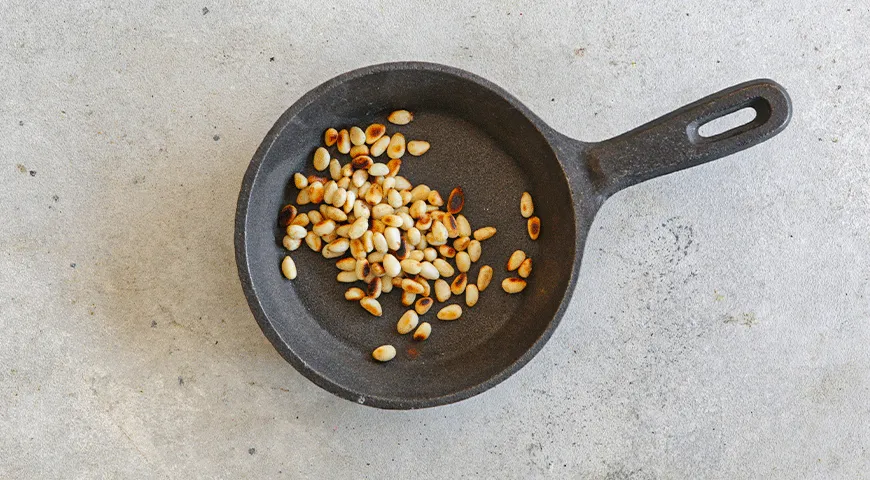 На сухой сковороде обжарьте кедровые орехи до светло-золотистого цвета, снимите с огня и остудите.