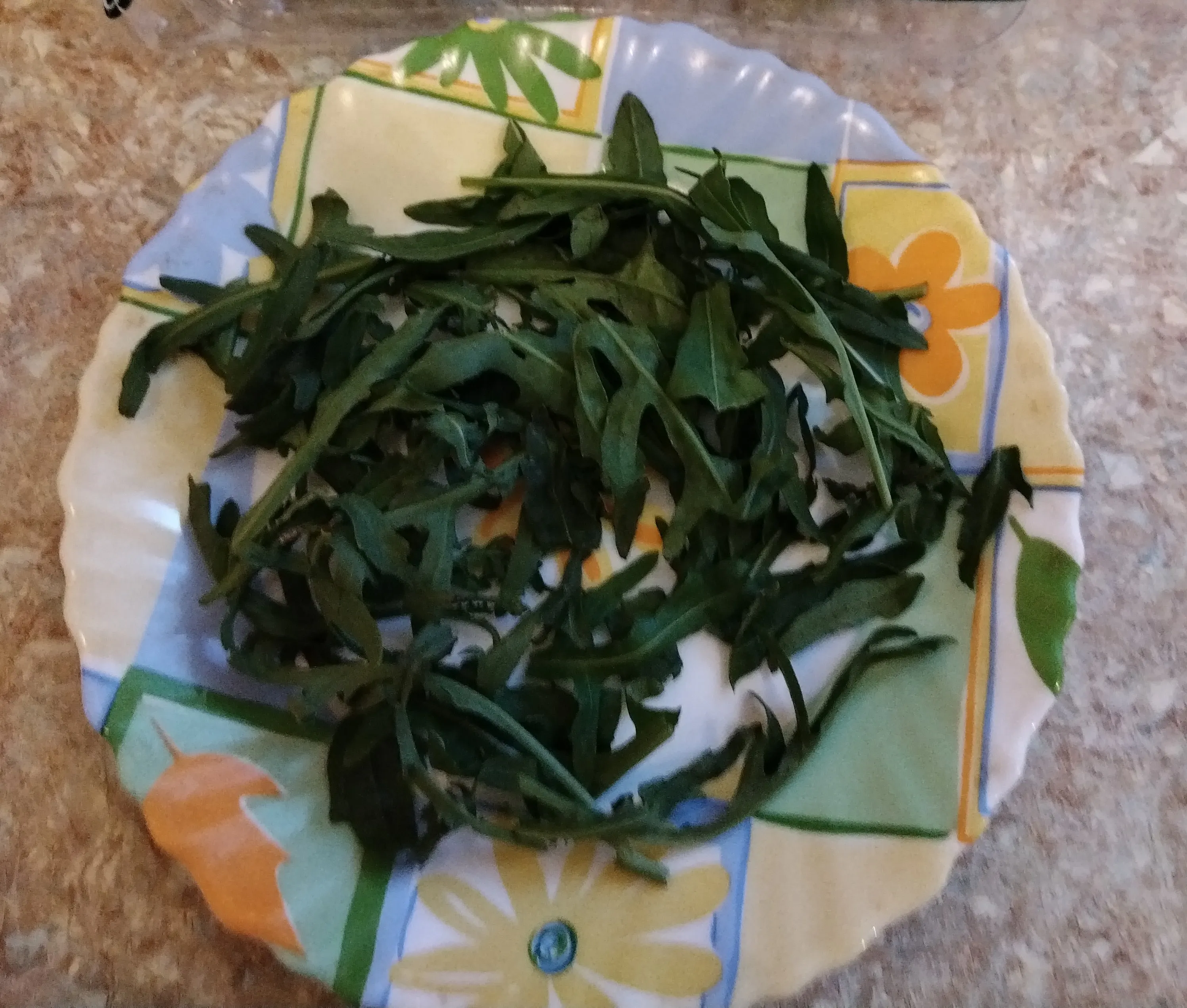 К этому салату с рукколой мы добавили гренки с тертым пармеханом и украсили пластинками пармезана же - получилось достаточно изысканное, но простое в приготовление блюдо.