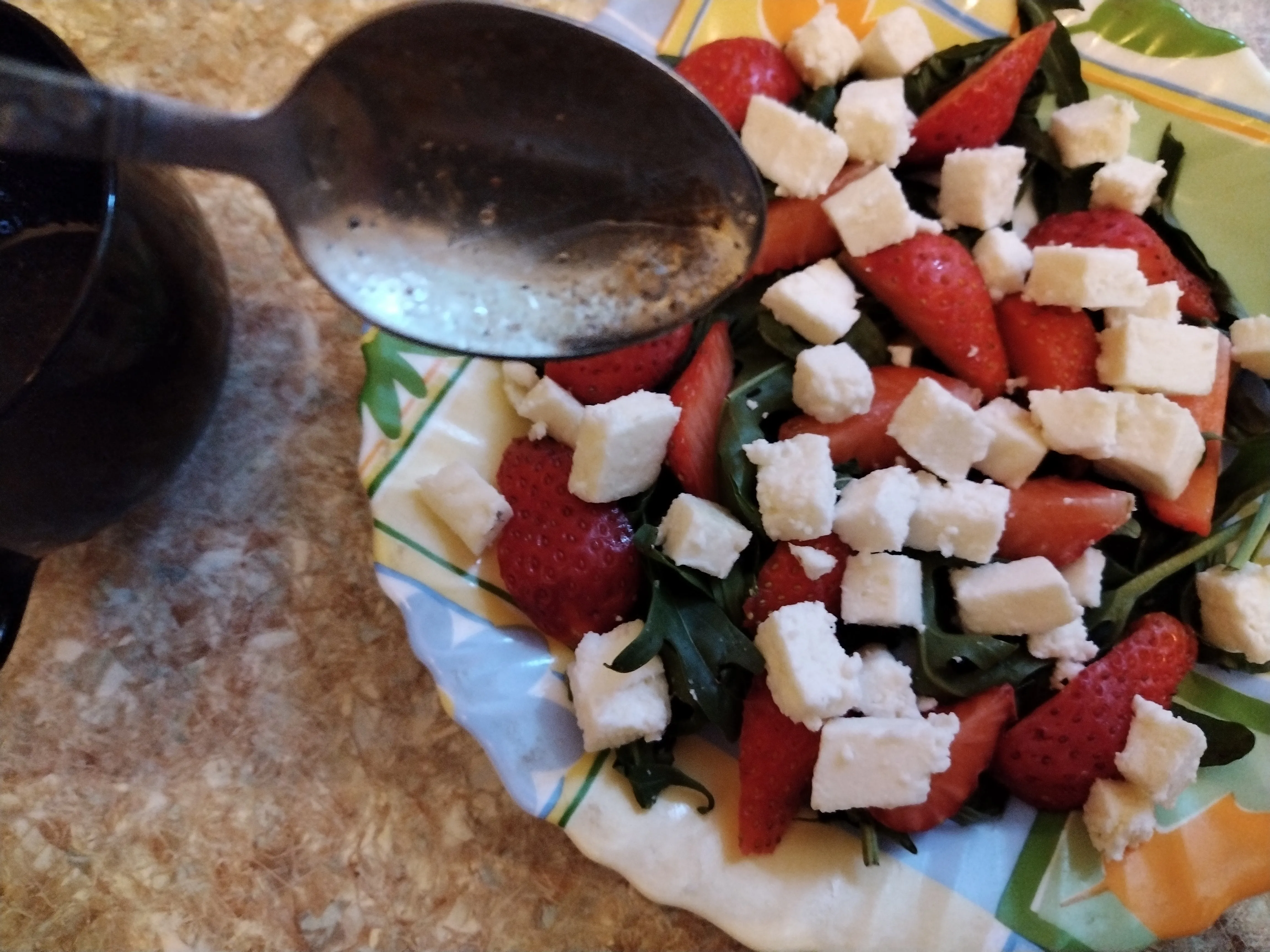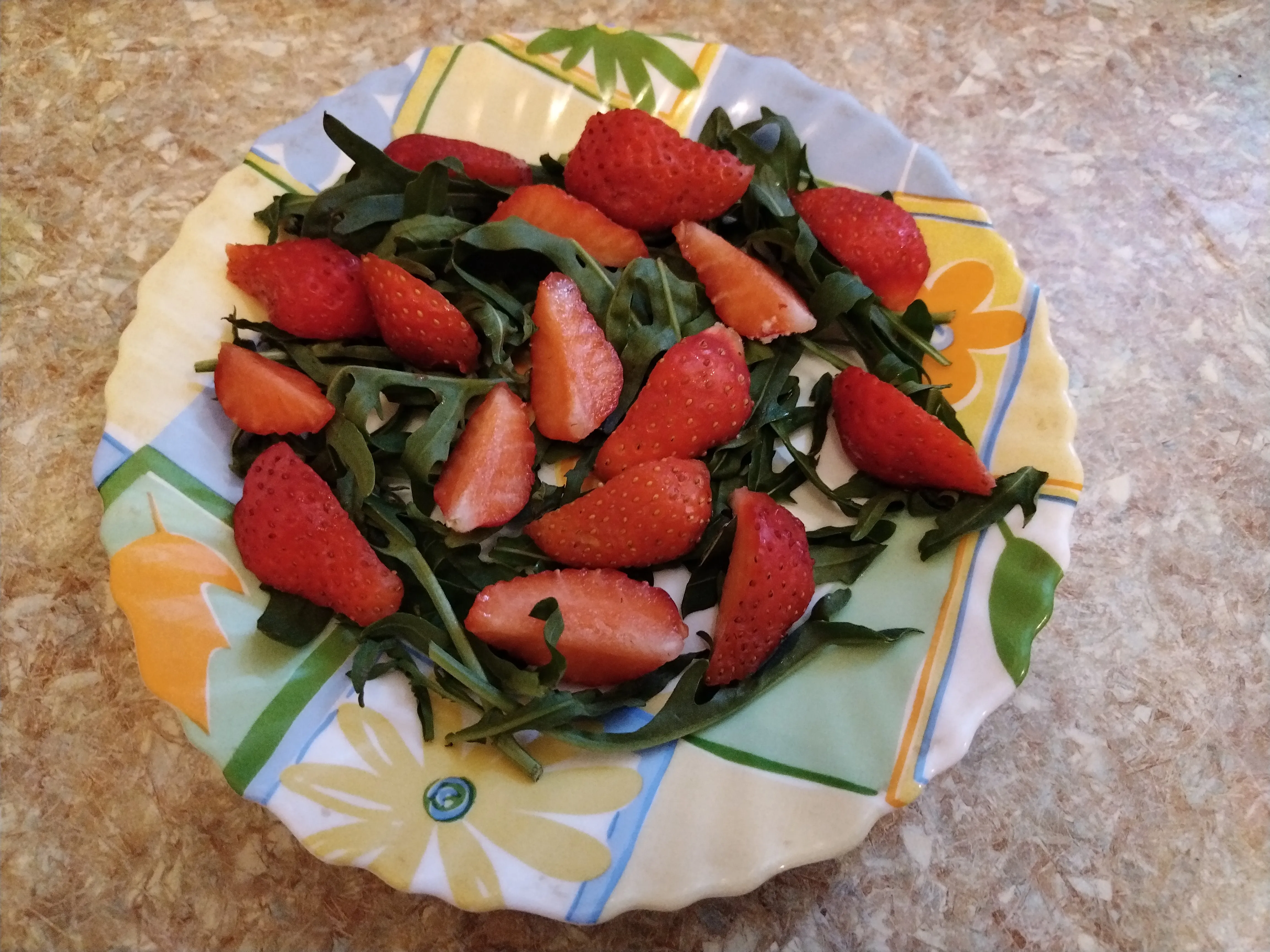 Клубнику очистите о плодоножек, помойте, нарежьте на четвертинки и выложите поверх руколы.
