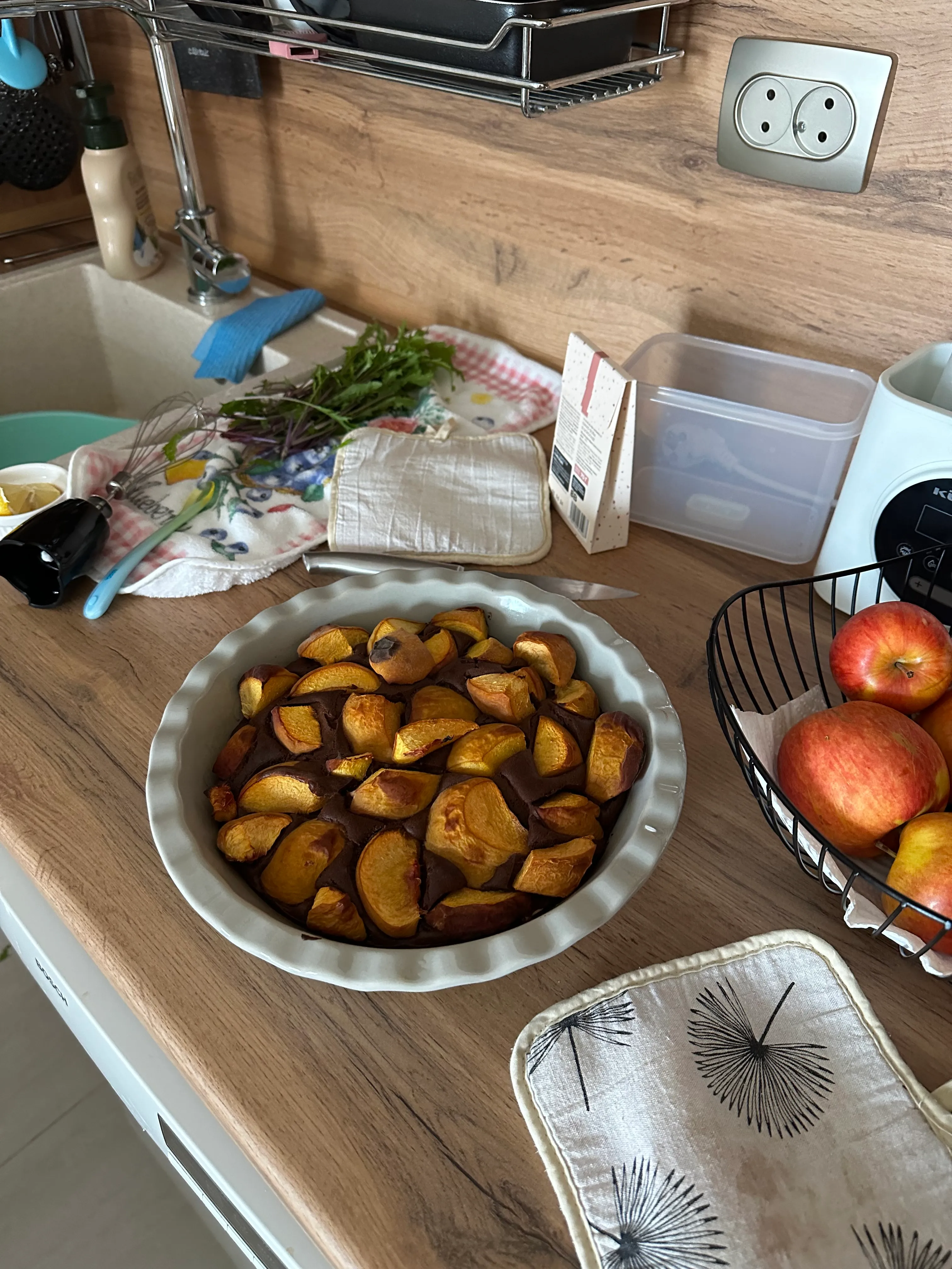 Этот шоколадный пирог с персиками мы готовим каждый год с июля по сентябрь. А когда хочется менее сладкой выпечки, вместо персиков добавляем вишню или даже сливу — попробуйте и вы все варианты! Количество сахара в рецепте можно регулировать по вкусу. Иногда мы печем пирог совсем без сахара, но подаем с пломбиром.