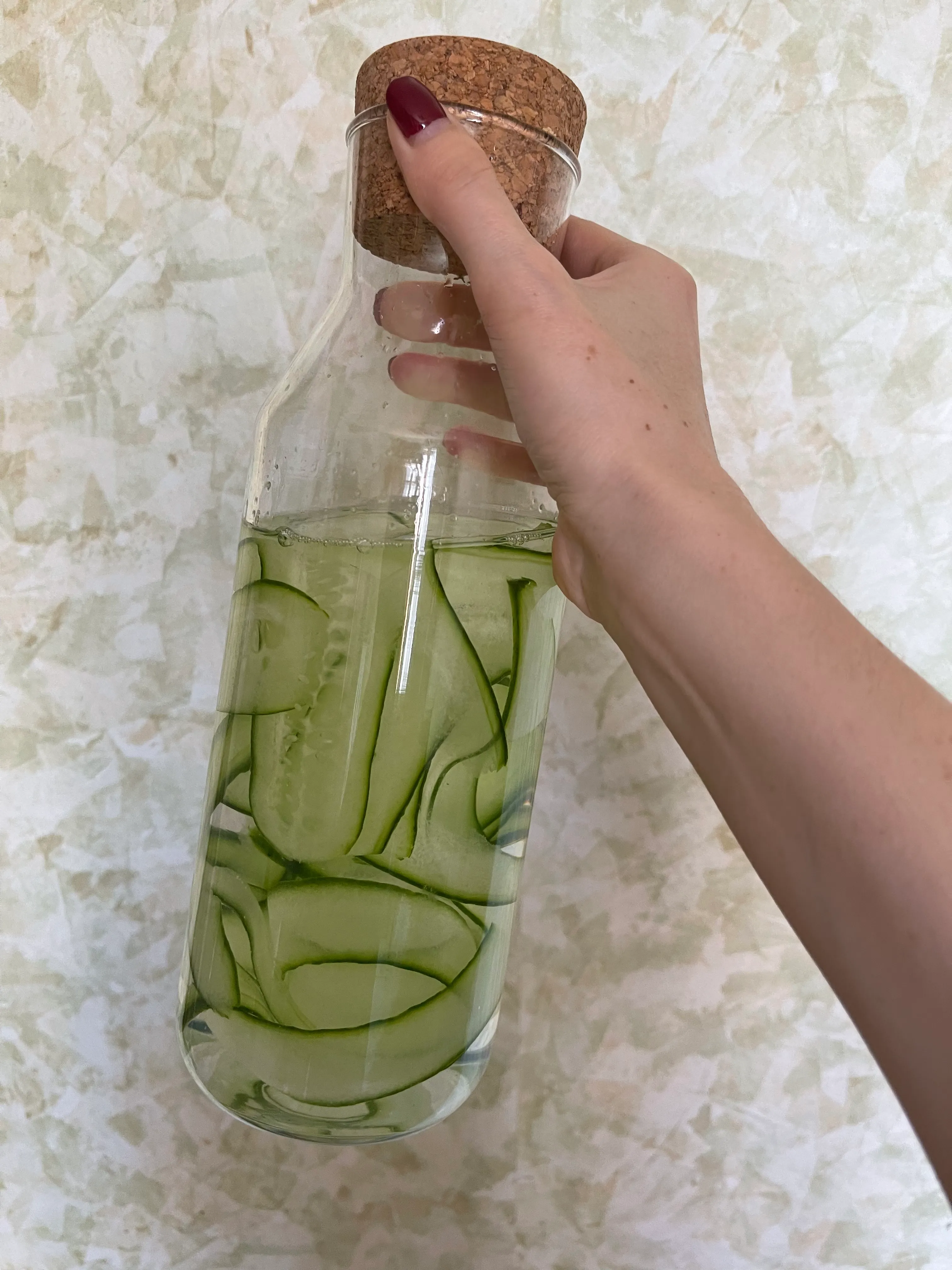 Залейте питьевой водой. Доливайте воду в графин каждый раз, когда она заканчивается. Половины огурца хватает на 3-4 литра освежающей воды.