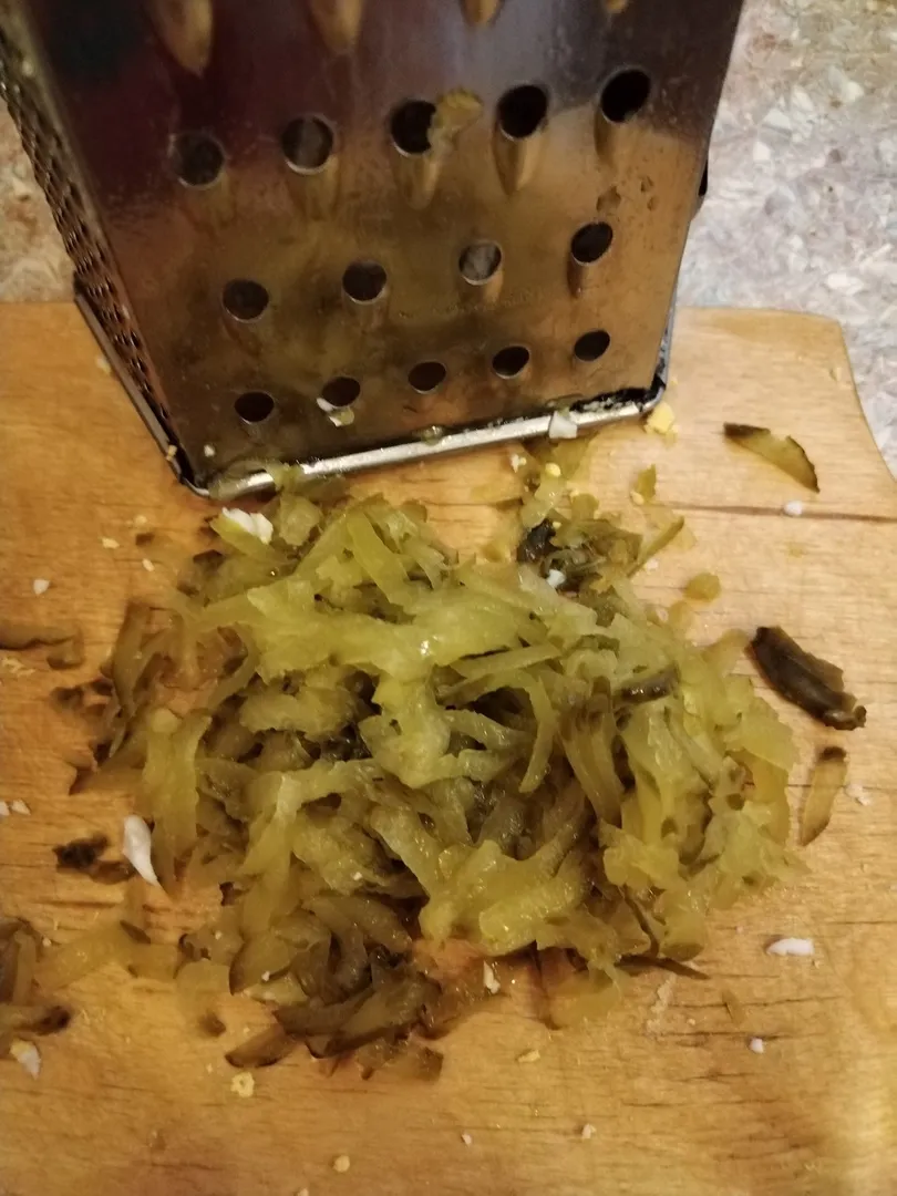 Натрите на терке соленый огурец и картофель. Добавьте к свекле.