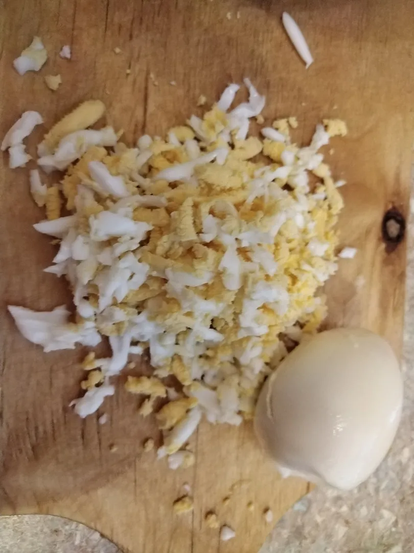 Одно вареное яйцо измельчите (можно тоже натереть на терке) и добавьте к другим ингредиентам.