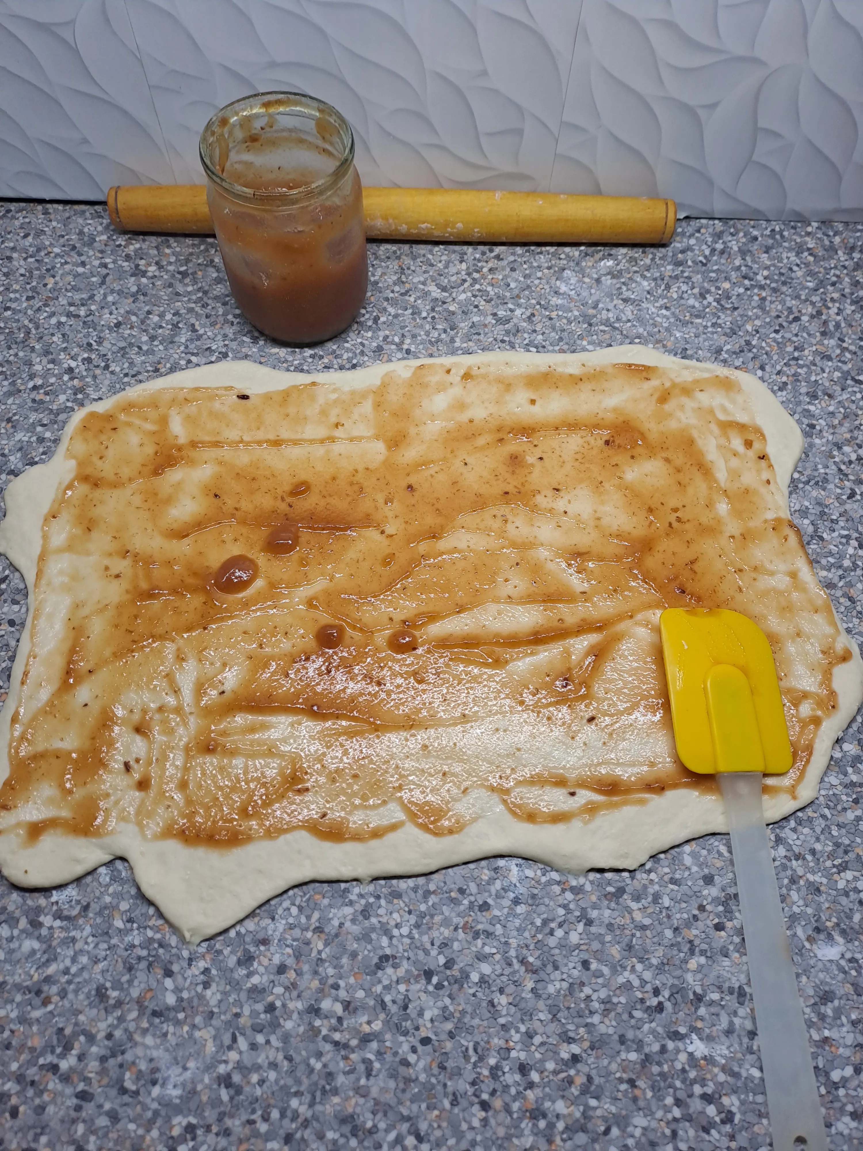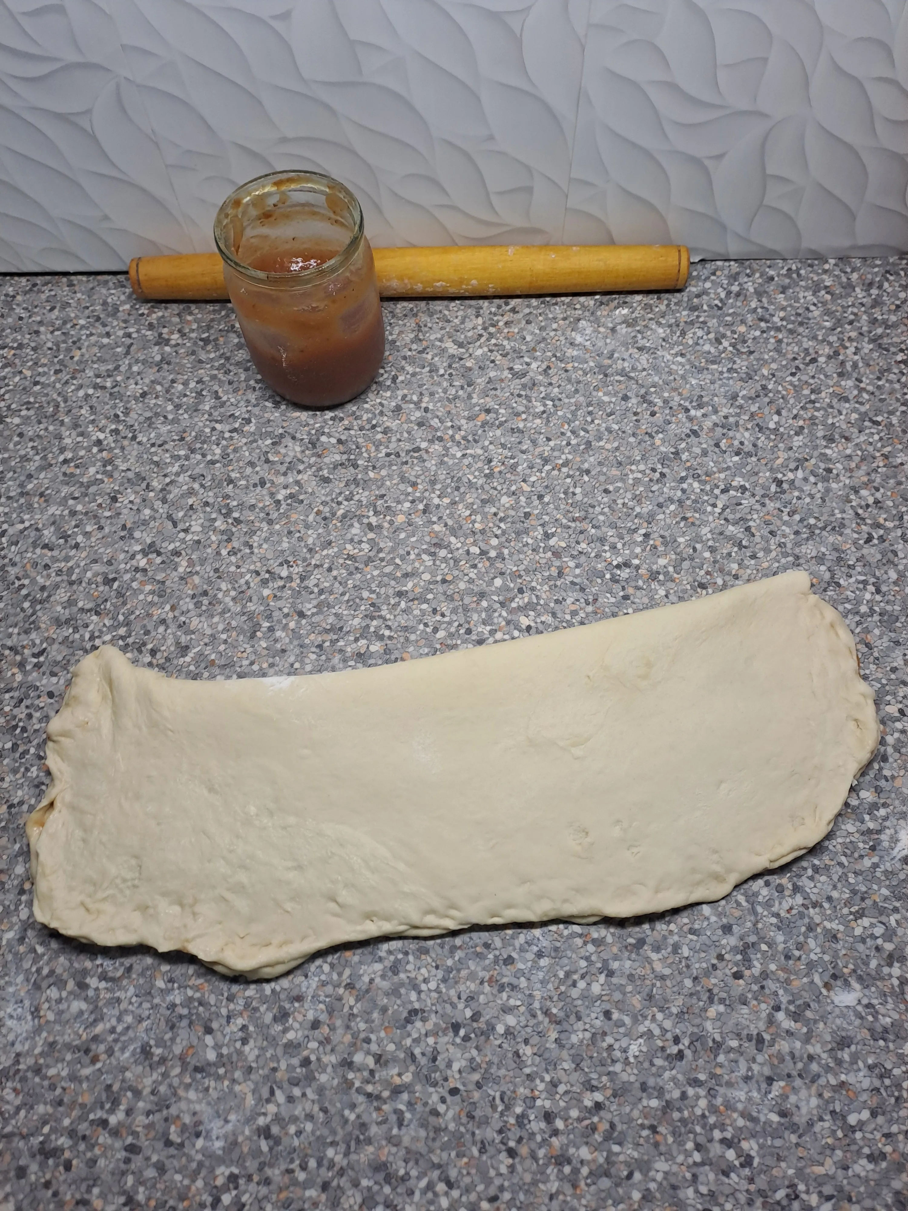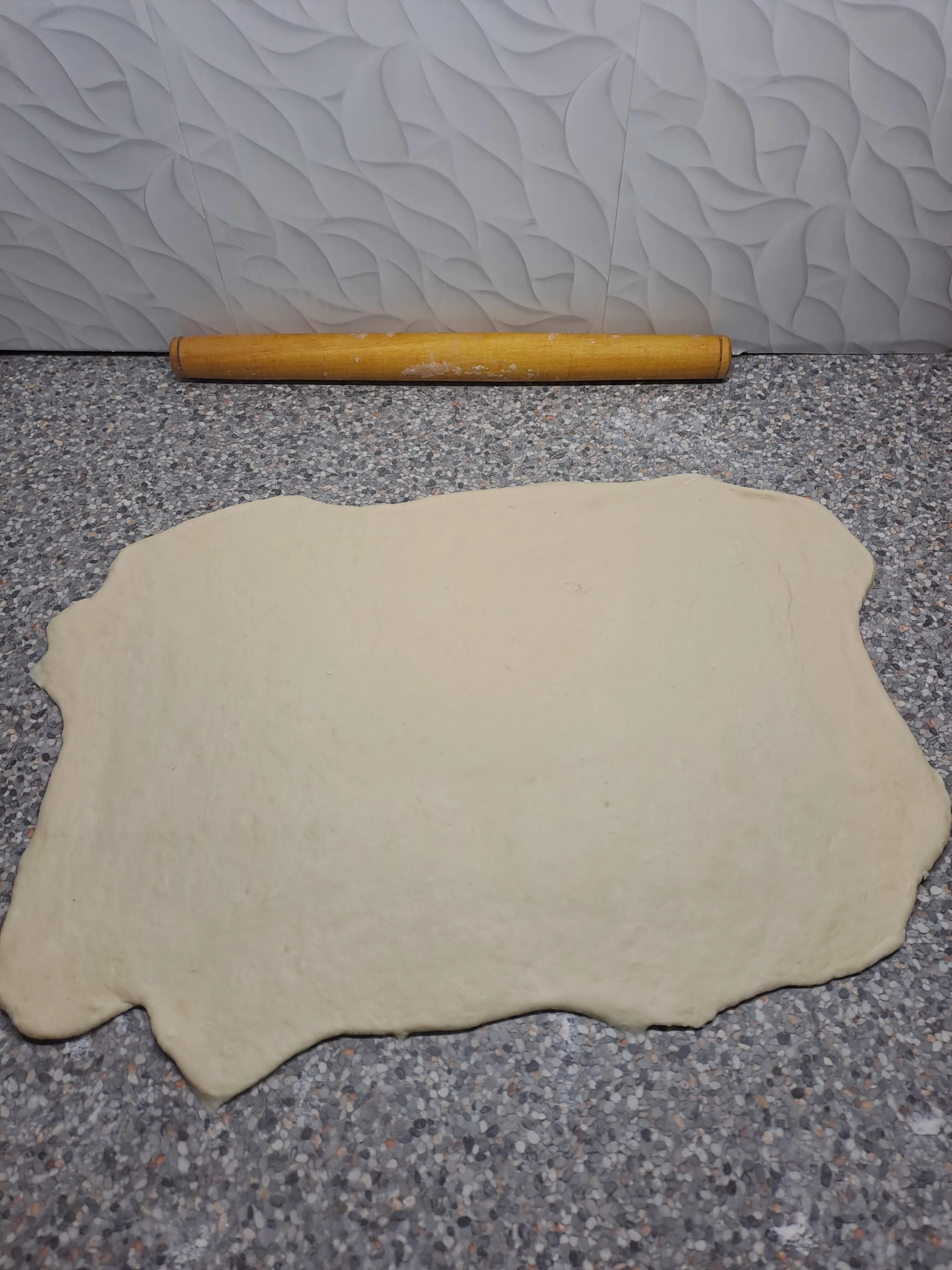 Присыпьте мукой рабочее место и выложите слоеное дрожжевое тесто. Раскатайте его в пласт.