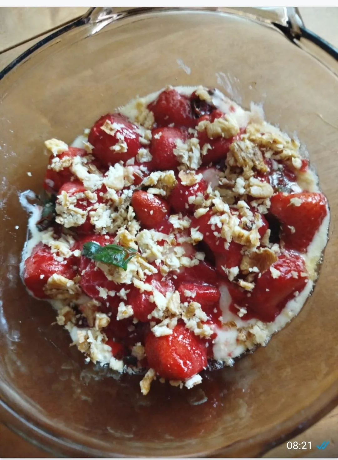 Достаньте сыр из духовки, сверху выложите клубнику, посыпьте измельченными орехами. Украсьте листиками мяты.