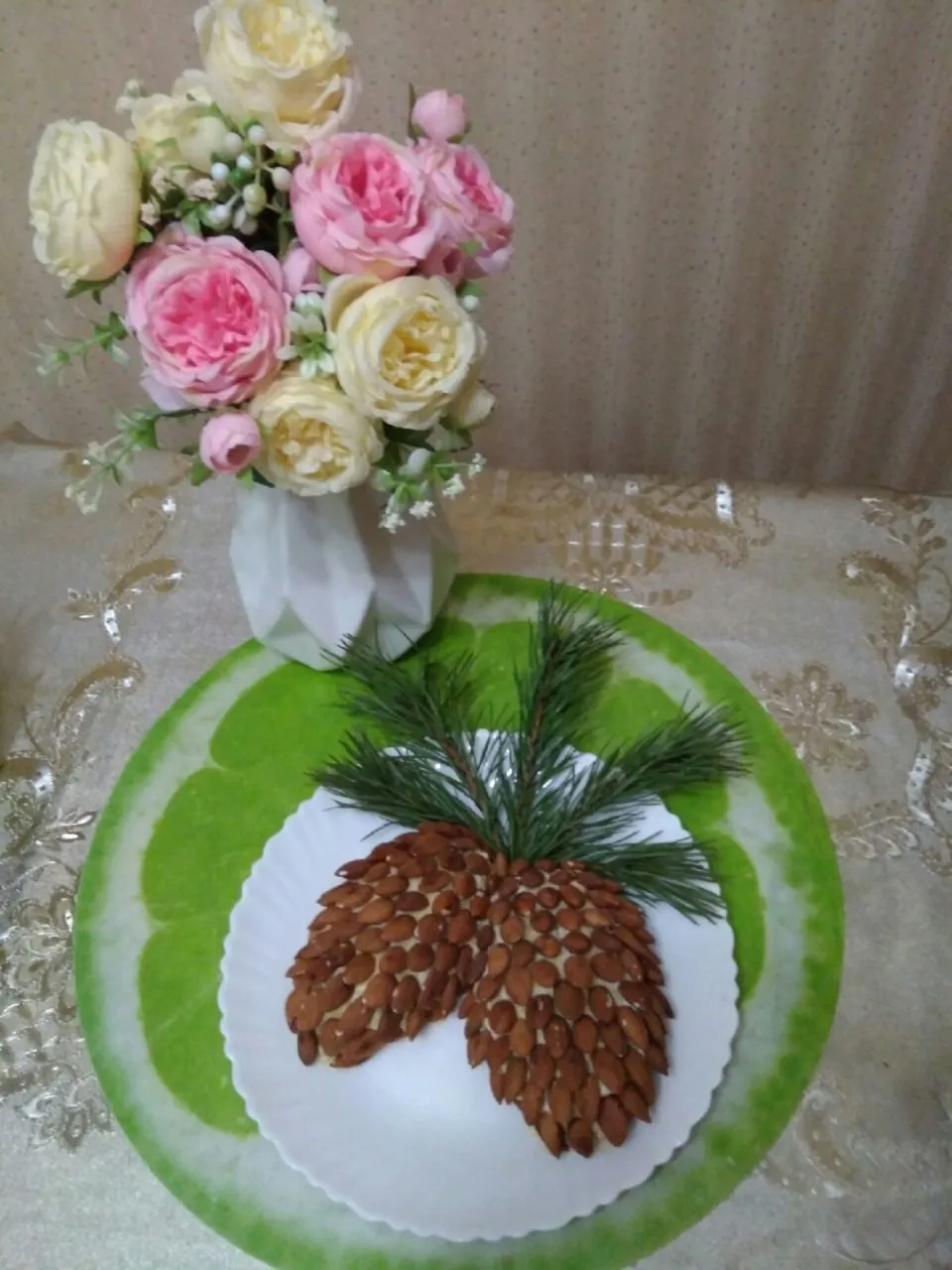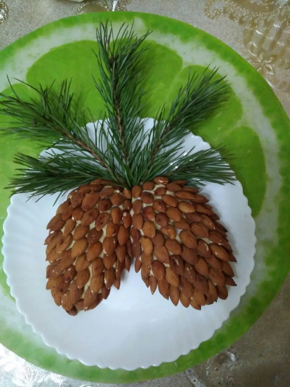 Мы уверены, что салат Шишка с миндалем когда-то был придуман креативной хозяйкой именно для новогоднего стола. Согласитесь: его внешний вид намекает на тесную связь с елкой, без которой самый любимый зимний праздник просто немыслим. Рецепт салата не слишком сложный, однако требует времени, что, конечно, стоит иметь в виду. В состав блюда входит немало ингредиентов, среди которых картофель и морковь, яйца, сыр, кукуруза, орехи, соленые огурцы и куриное филе. Что касается последнего, то многие хозяйки используют копченое, но и просто отварное подойдет ничуть не хуже. Ингредиенты выкладывают слоями в виде шишки, промазывая майонезом, а верх украшают миндалем, имитирующим чешуйки. Останется только декорировать салат розмарином, напоминающим еловые веточки, и все готово!