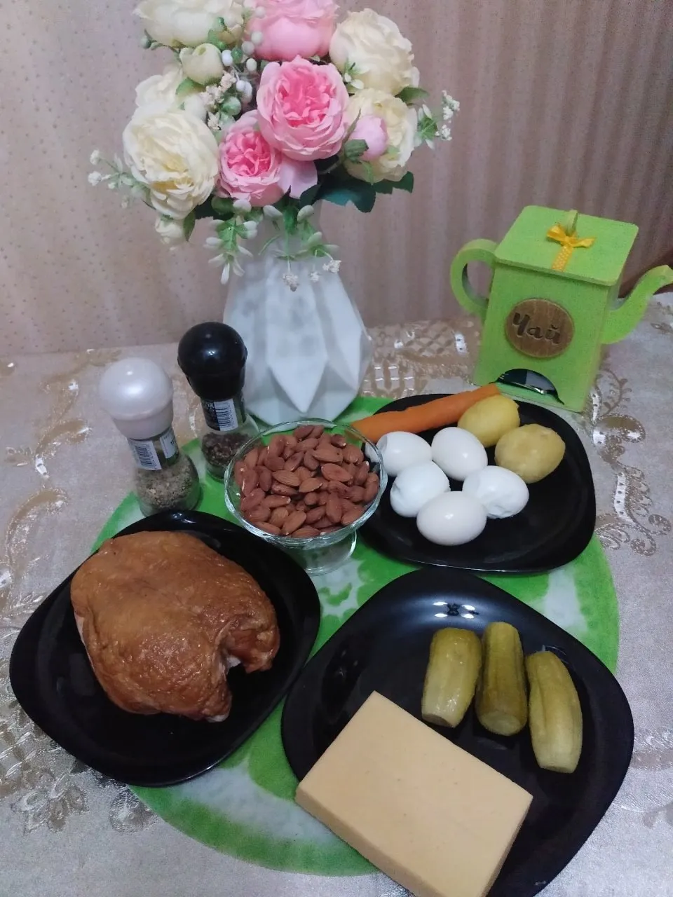 Картофель разделите на 2 части. На блюдо выложите его в форме двух шишек, сверху слегка смажьте майонезом. Следующим слоем выложите куриное филе, снова смажьте майонезом.