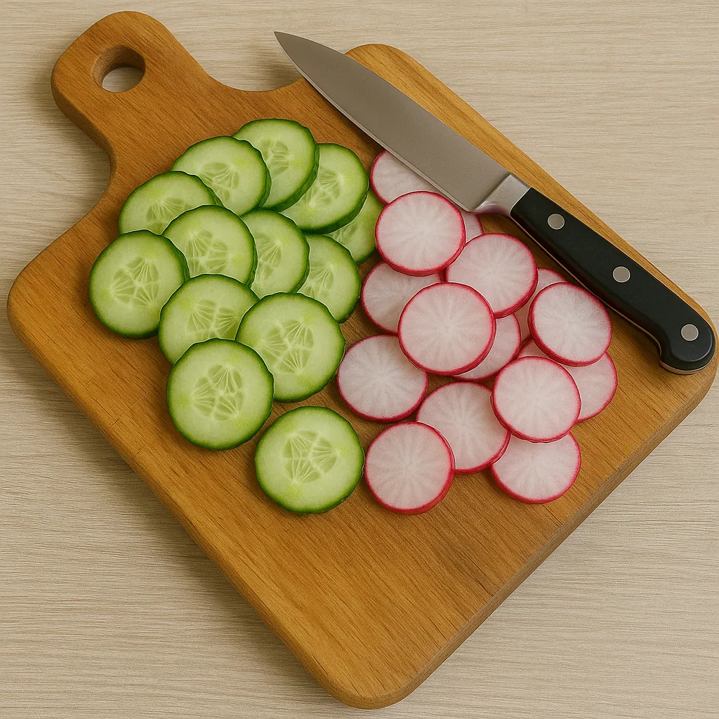 Редис и огурец хорошо промойте и нарежьте тонкими ломтиками.