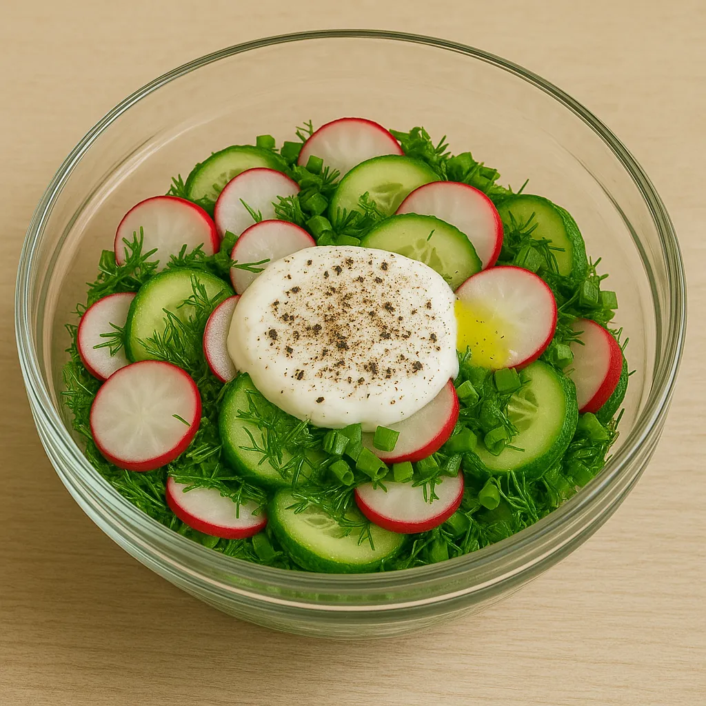 Салат из дачной зелени, свежей редиски и огурцов часто подают со сметаной или сметанной заправкой, как в нашем рецепте. Это не самый низкокалорийный вариант, но точно один из вкуснейших. Сливочная сметана с деликатной кислинкой отлично сочетается с самыми разными зелеными продуктами. Можно не ограничиваться набором овощей, предложенных в рецепте, и добавить, скажем, спелые сладкие помидоры разных цветов — темно-бордовые, классические красные, желтые. Наслаждаться красками и витаминами можно в любой сезон, стоит только позволить себе положить в тарелку много зелени и овощей и немного пофантазировать.