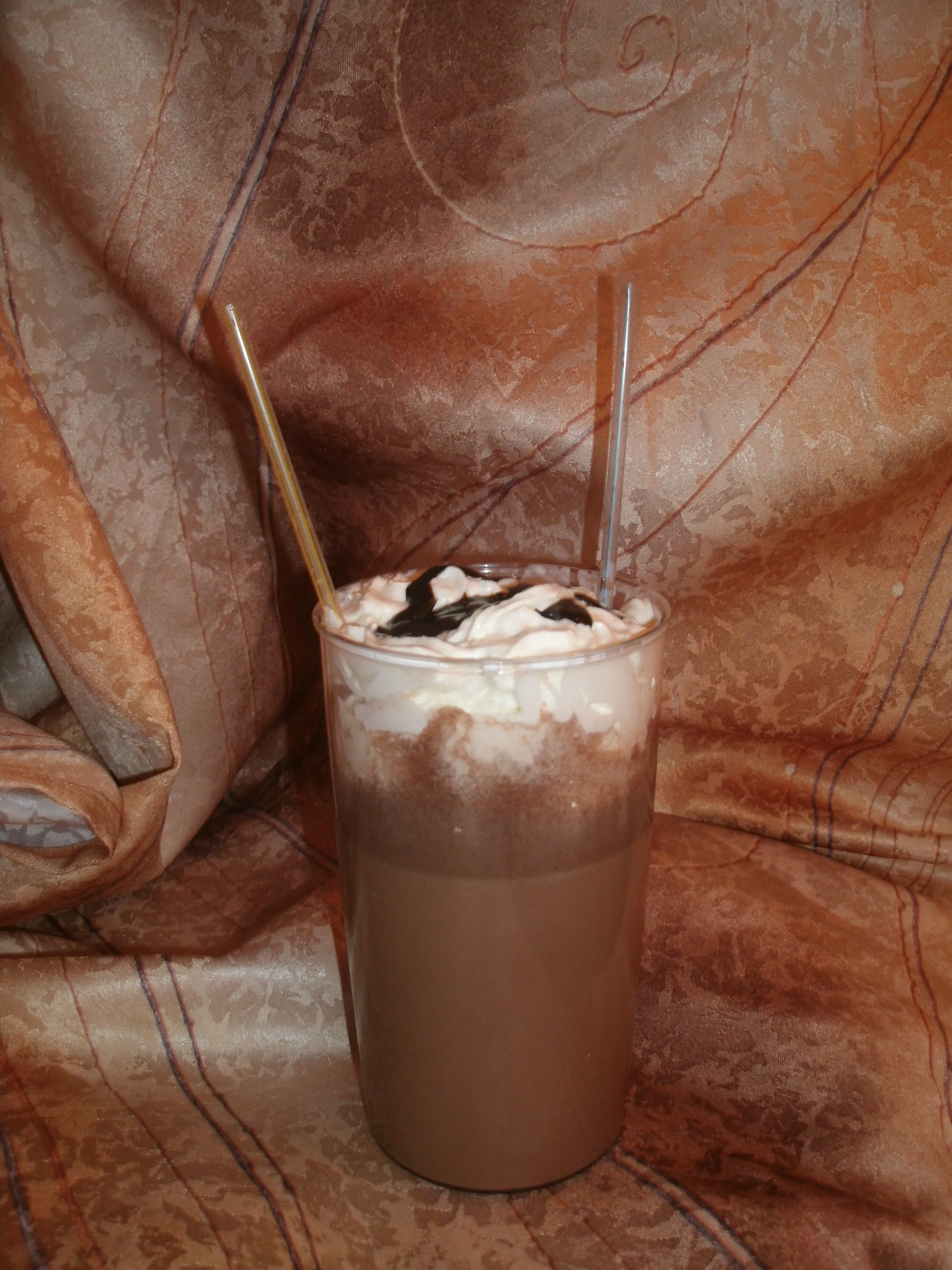 Кофейно-молочную смесь перелейте в высокий стакан, сверху выложите пену из взбитых сливок. Украсьте полосками растопленного шоколада.