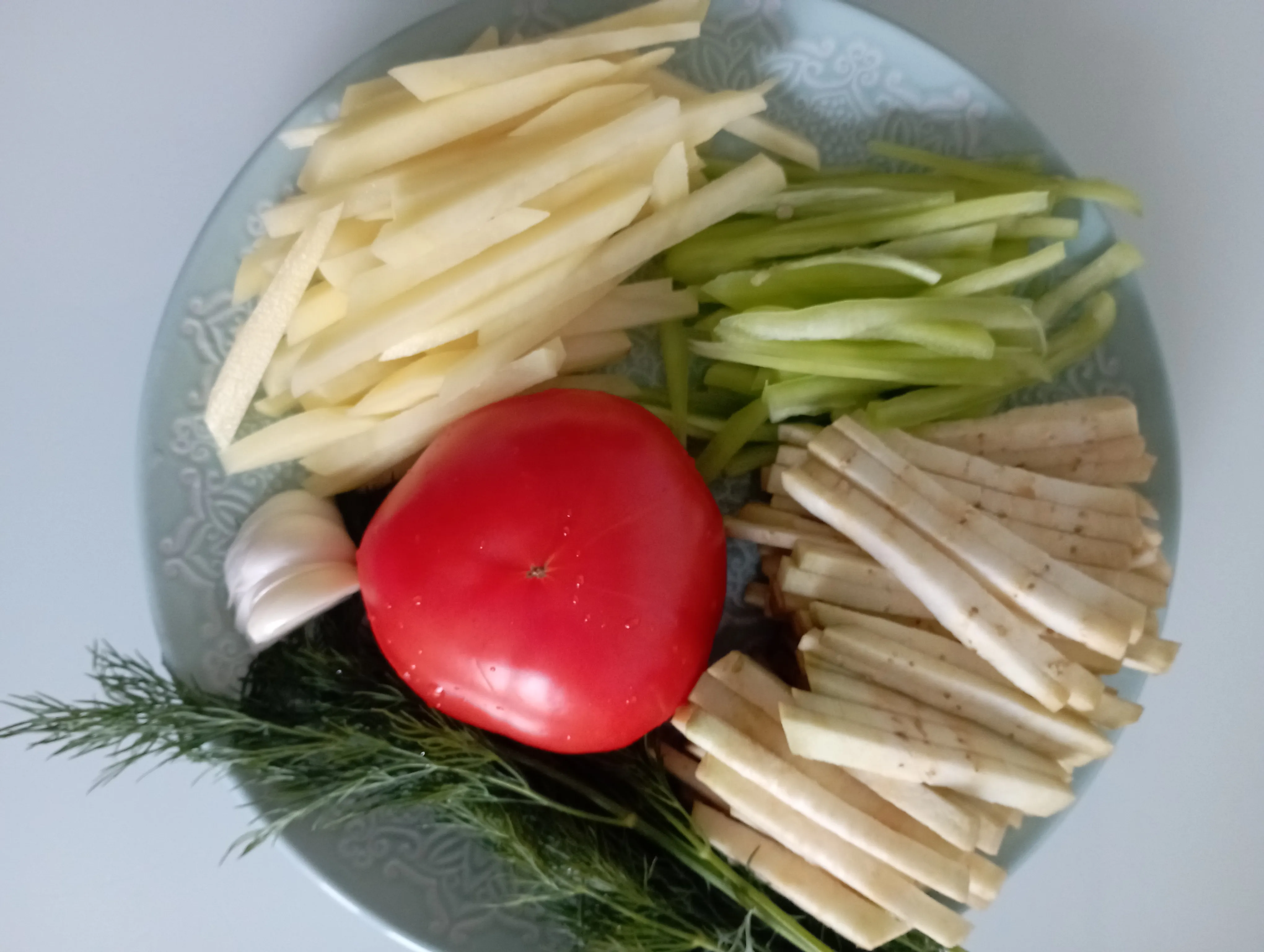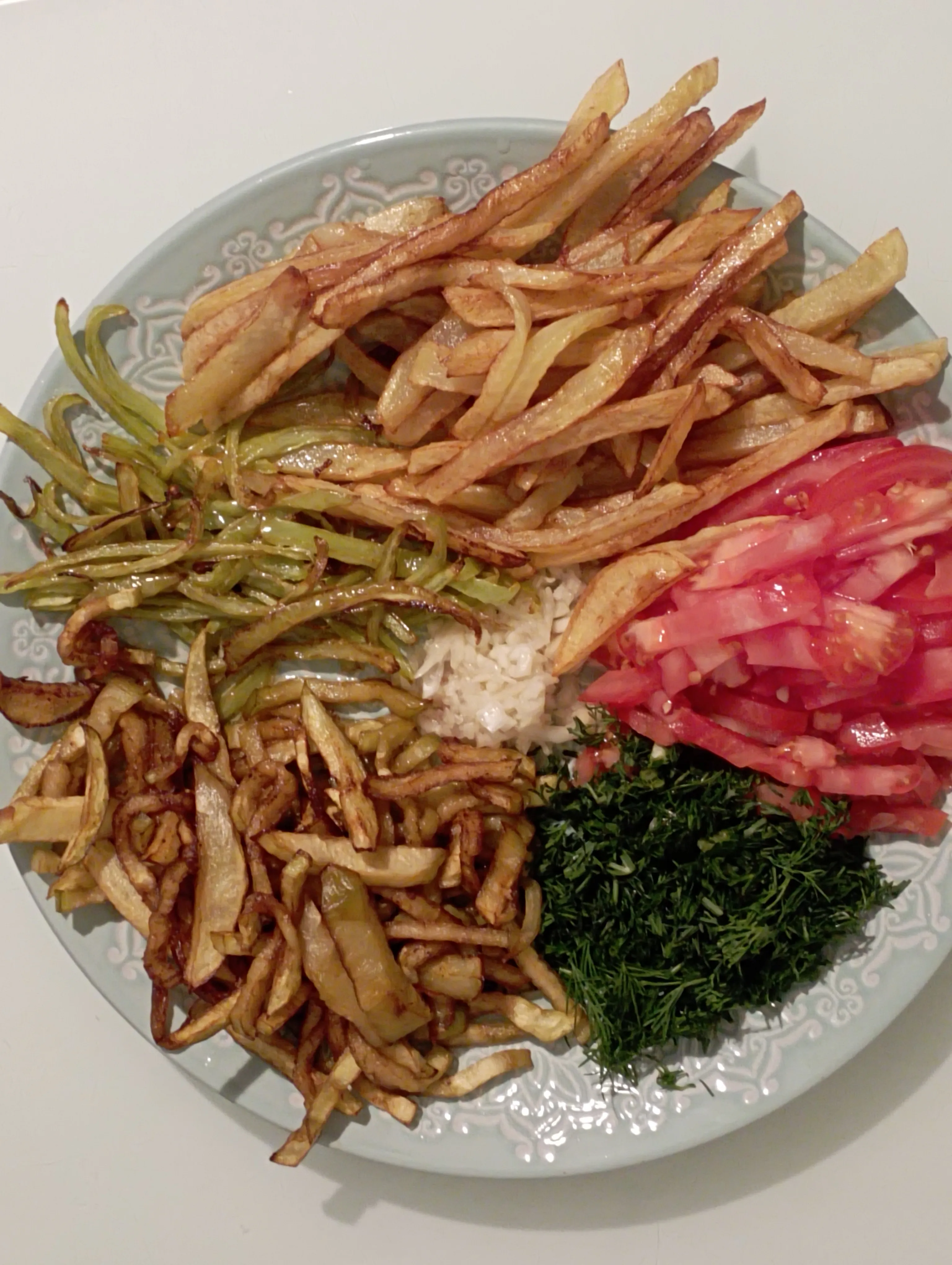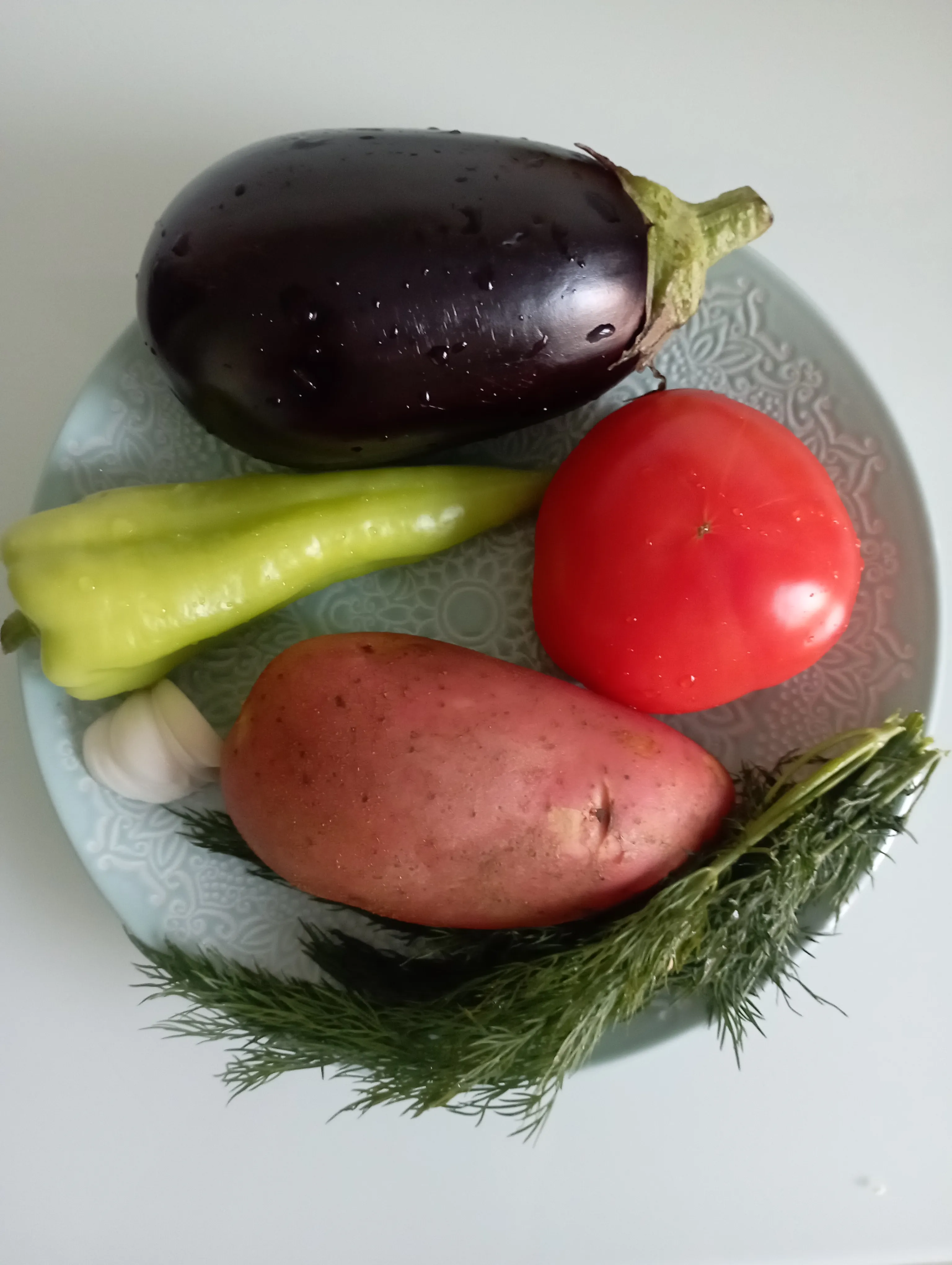Отдельно пожарьте в масле до готовности и румяного цвета картофель, перец и баклажан. Выложите овощи горками на тарелку. Нарежьте соломкой помидор, мелко - укроп, измельчите чеснок и тоже выложите на тарелку.