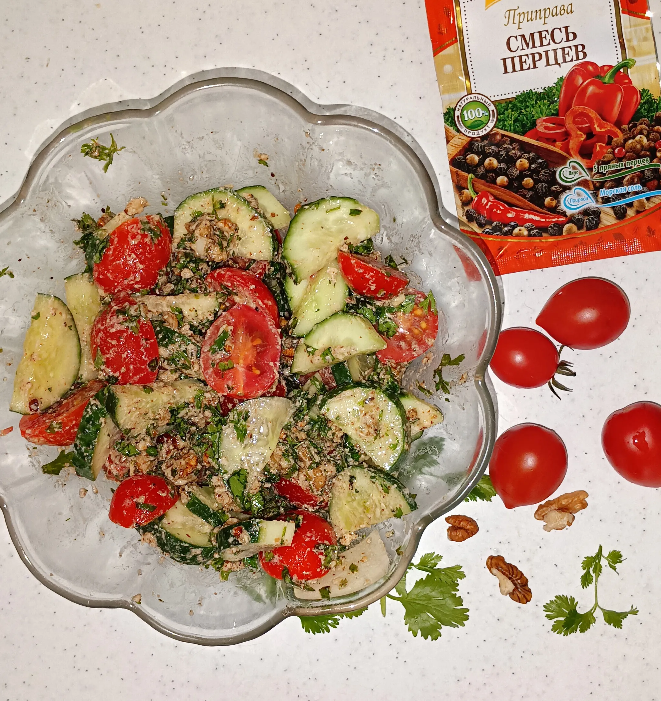 Для меня салат по-грузински обладает тремя отличительными чертами: первая - там будет красный перец, вторая - огурцы будут без кожи, и последняя - зимой такой салат не сделать (помидоры и зелень там не тепличные).