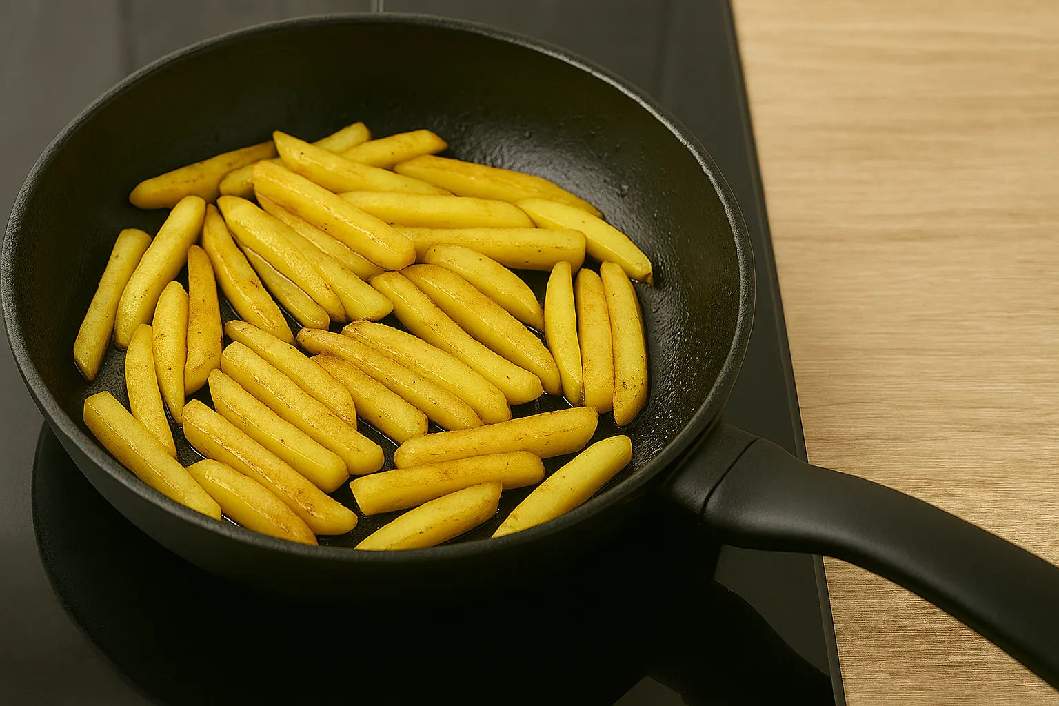 На сковороде с разогретым растительным маслом обжарьте картошку до золотистой корочки (15–20 мин.), периодически помешивая. Посолите.