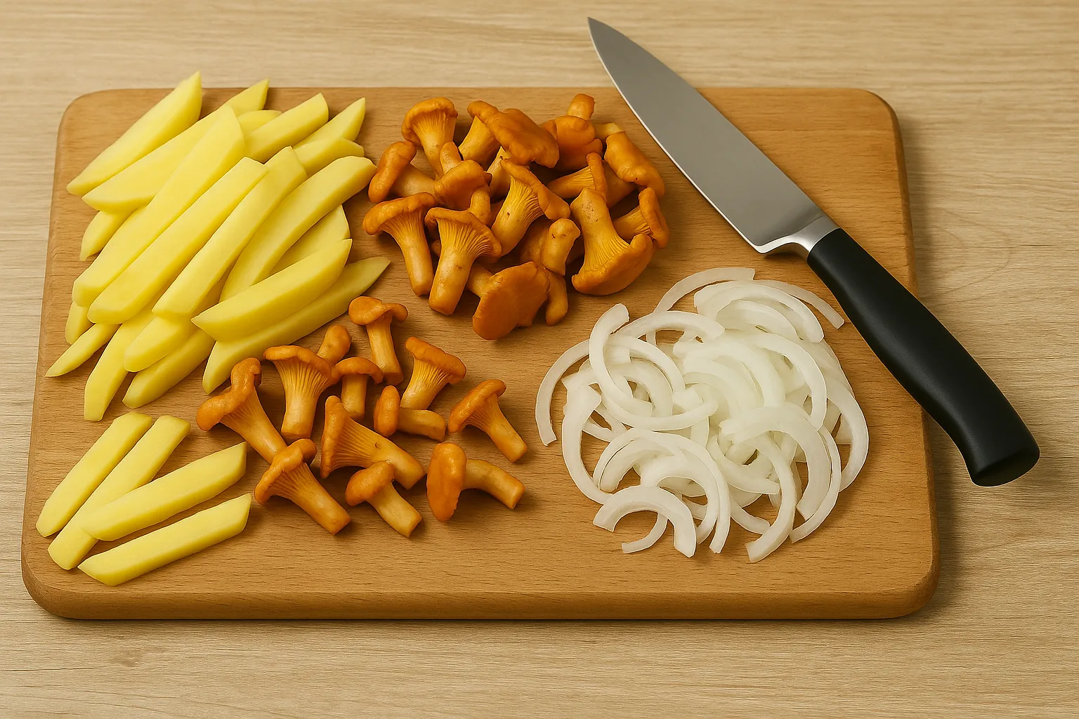 Картошку нарежьте брусочками. Лисички хорошо промойте, крупные — разрежьте пополам. Лук — полукольцами.