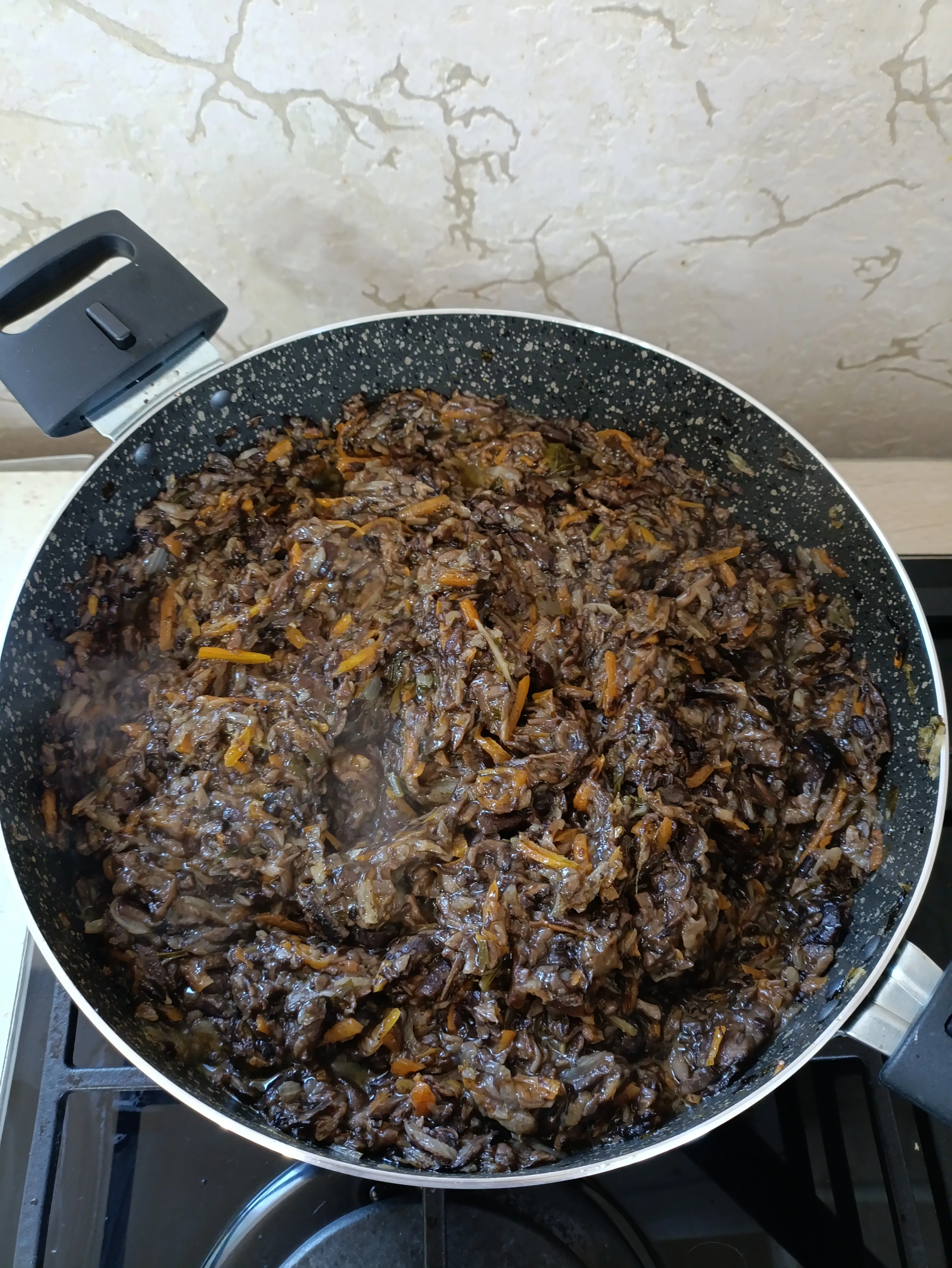 Отваренные грибы тоже нашинкуйте и отправьте на сковородку к морковке и луку. По желанию можно добавить чеснок. Посолите и поперчите по вкусу. Тушите все вместе 20 мин. на медленном огне. В конце добавьте уксус, перемешайте.