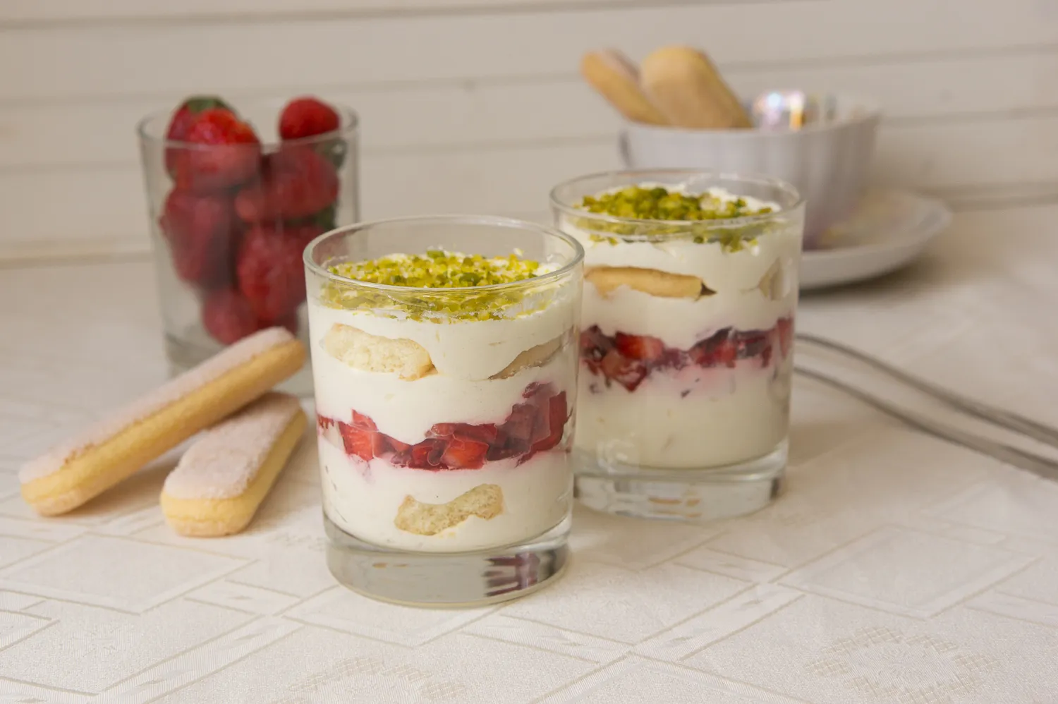 Уложите все составляющие десерта в креманки, чередуя слои: крем-печенье-крем-клубника — чем больше будет слоев, тем интереснее получится десерт.