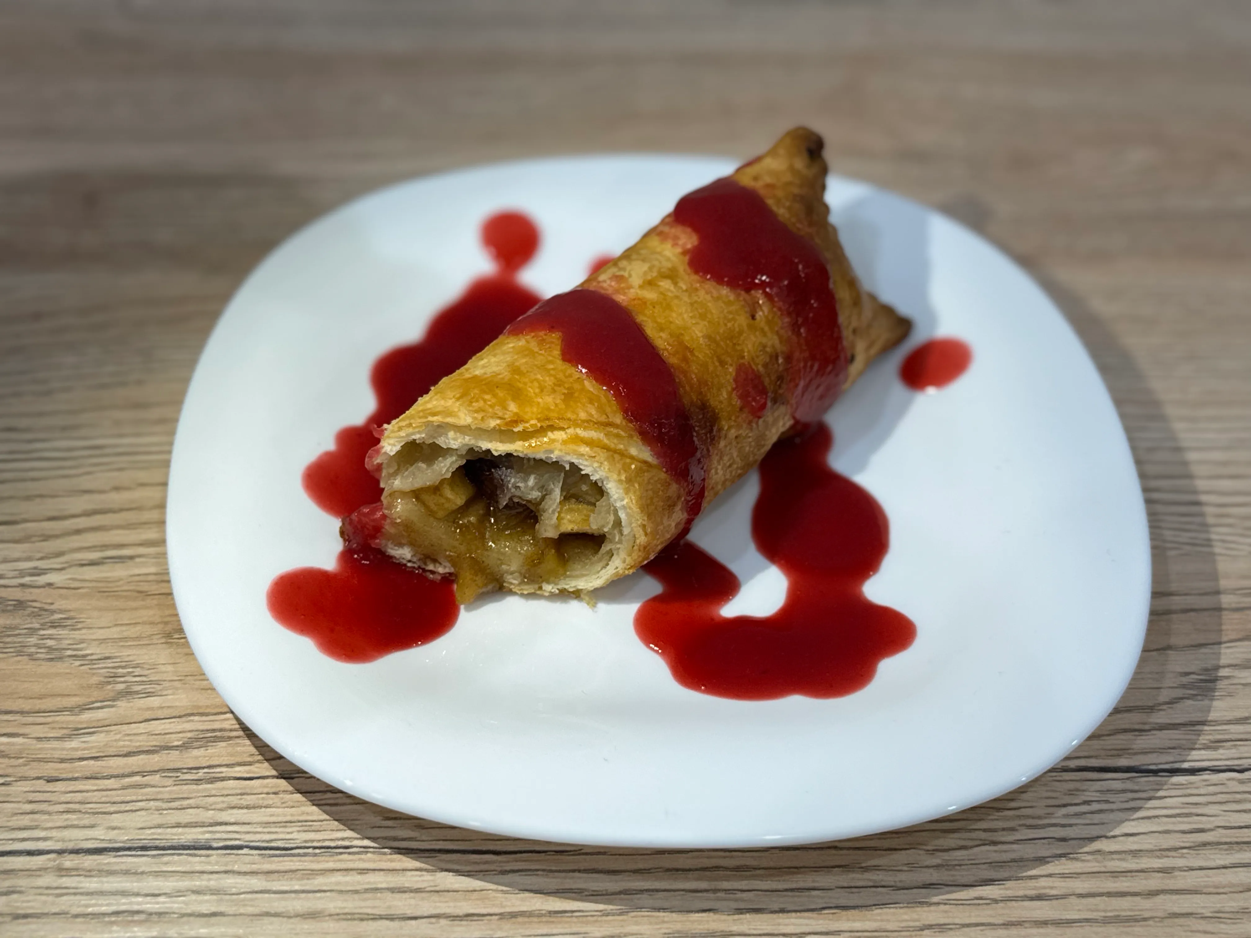 Готовый яблочный штрудель переложите на тарелку и подавайте к столу. Особенно вкусен он с вишневым джемом.