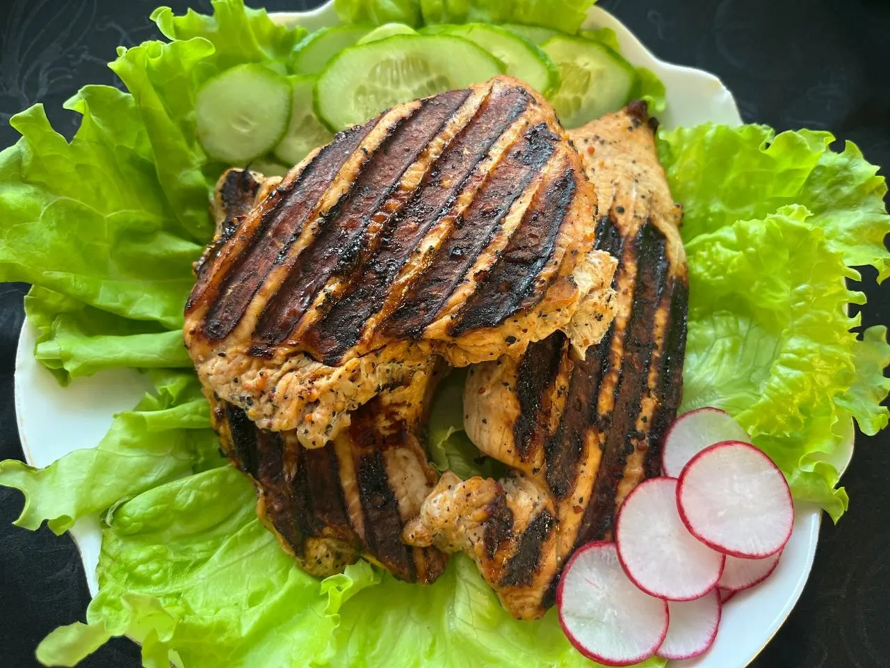 После завершения жарки снимите индейку с огня и дайте ей отдохнуть около 15-20 минут, накрыв фольгой — это позволит сокам распределиться по мясу. Подавайте со свежими овощами и зеленью.