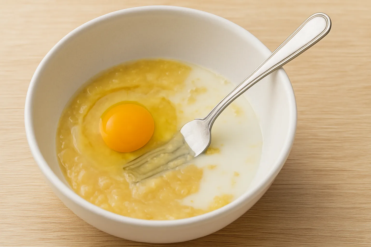 Добавьте в миску с бананом яйцо и молоко, перемешайте до однородности.